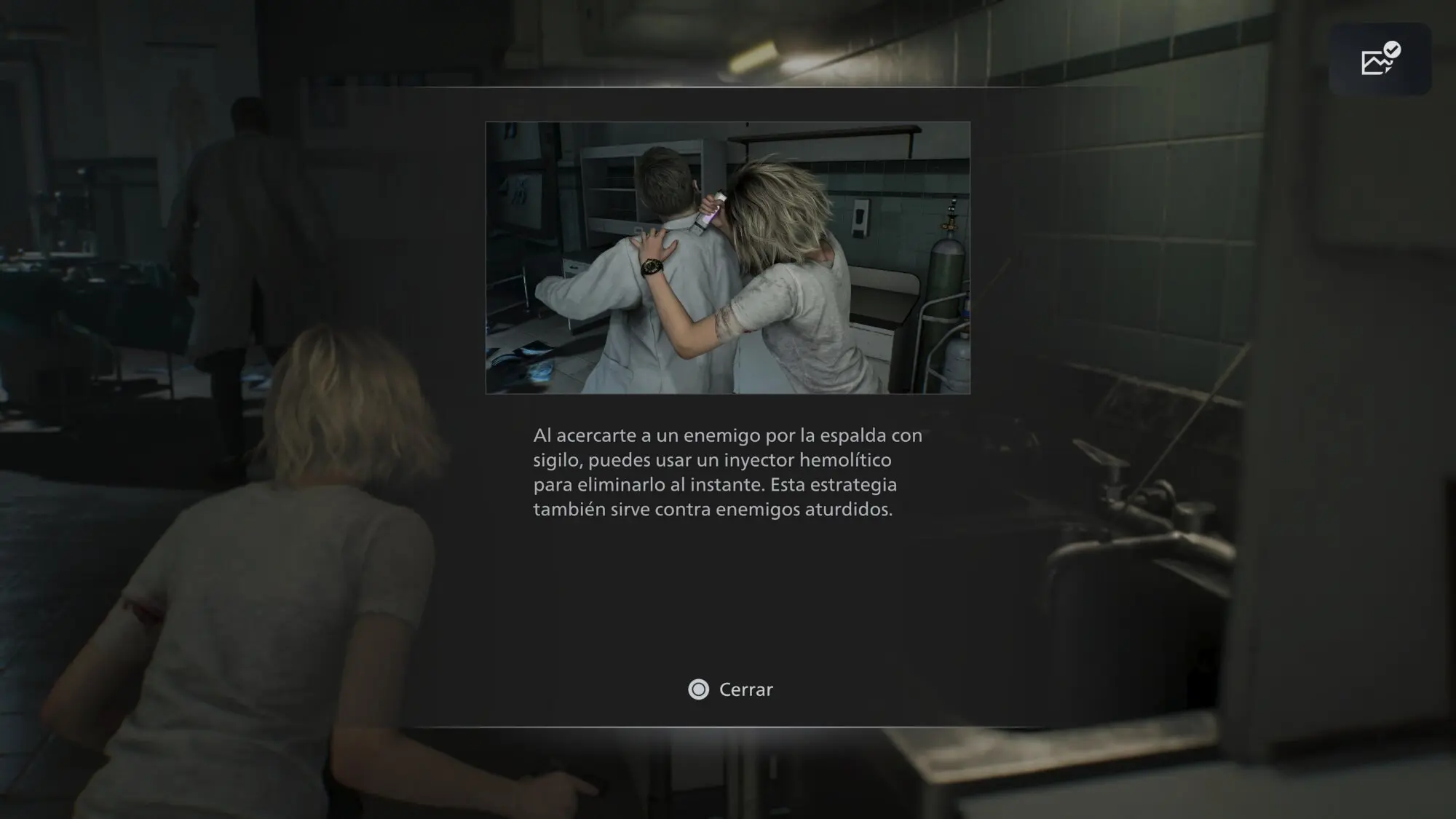 El tutorial que aparece al recogerlo amplía ese uso: acercándose a un enemigo por la espalda en modo sigilo, el inyector lo elimina al instante sin necesidad de disparar. La misma mecánica funciona contra enemigos aturdidos — cualquier infectado que Grace haya desequilibrado con un impacto puede ser rematado de esta forma, ahorrando munición y evitando ruido.