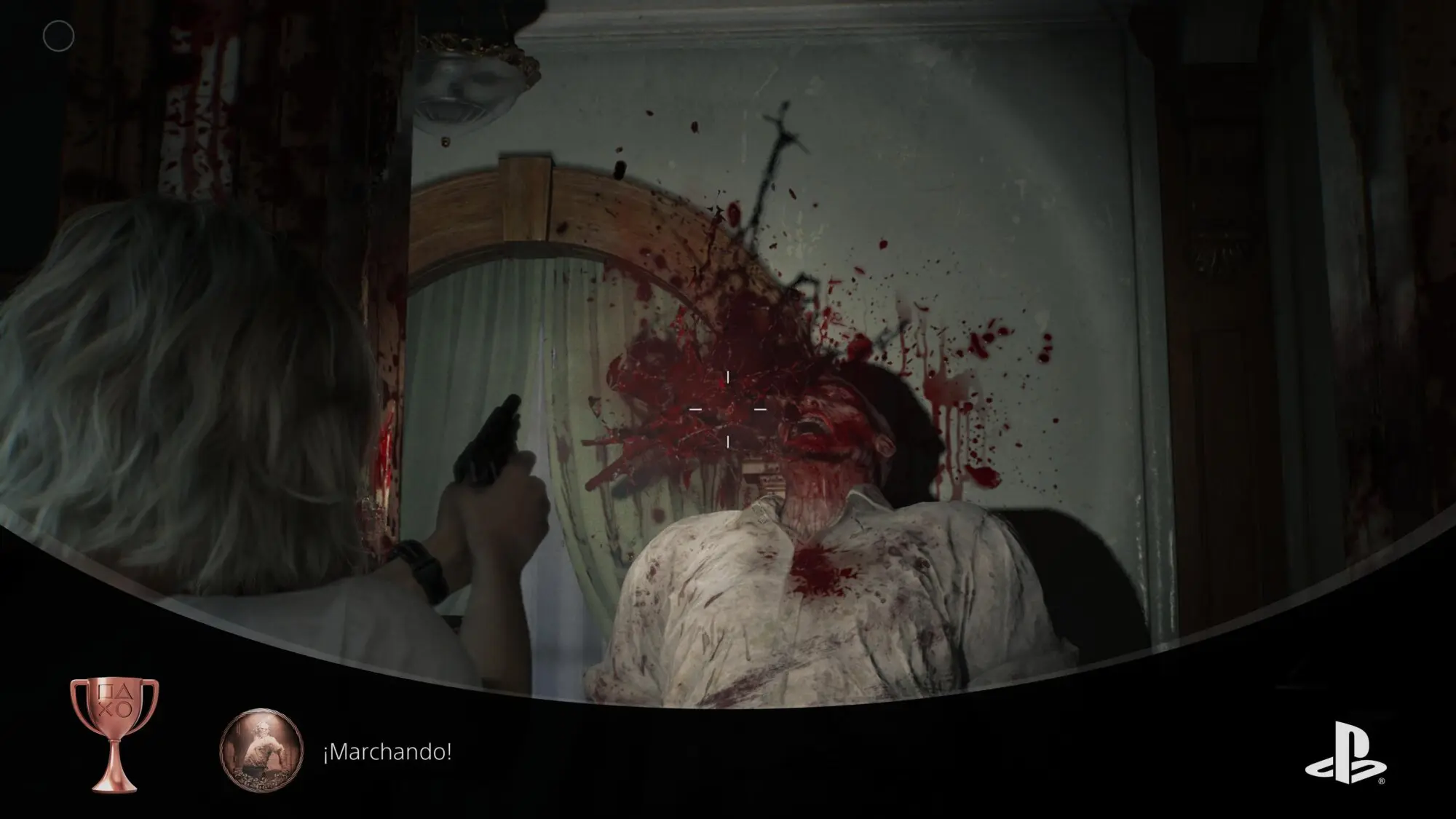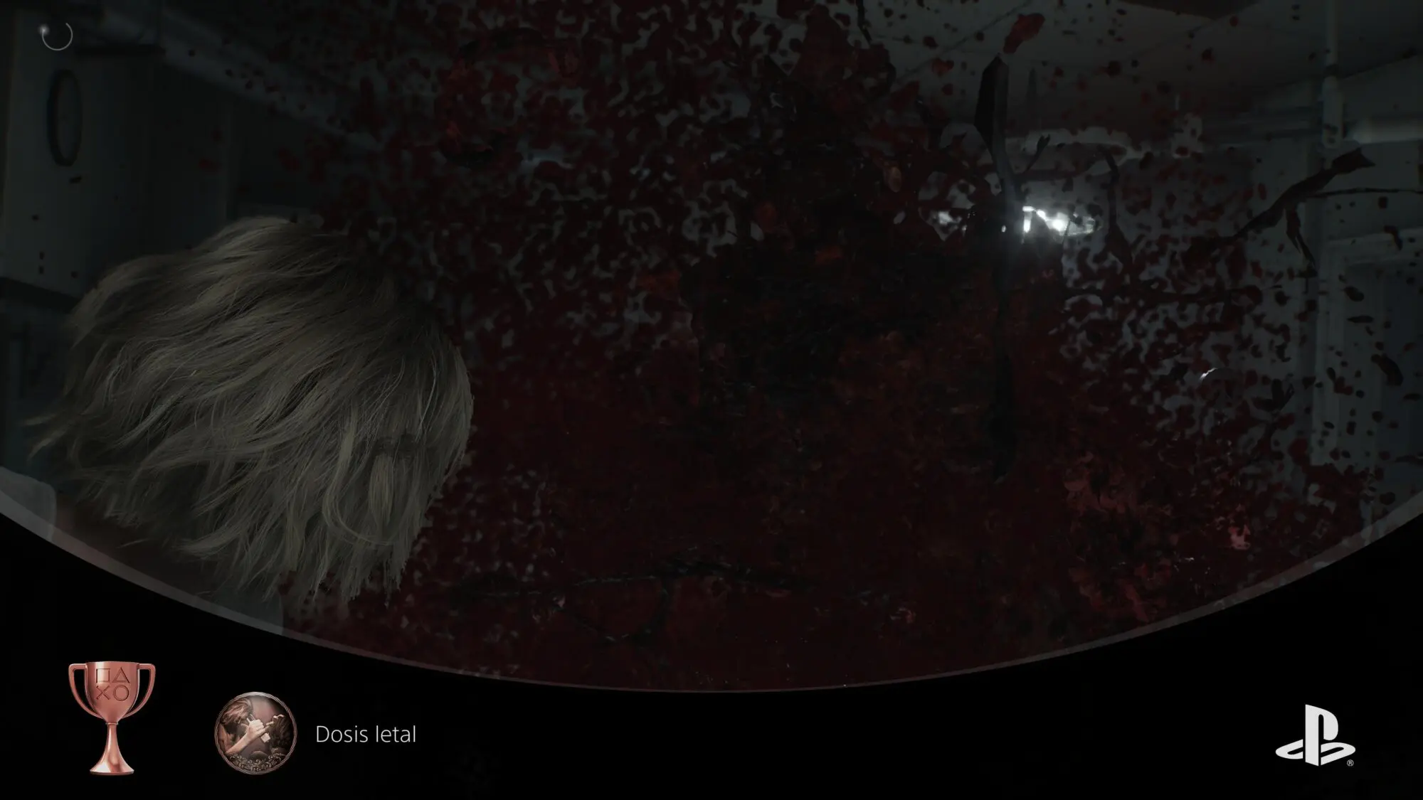El trofeo de bronce "Dosis letal" se desbloquea en este punto — la primera ejecución con sigilo usando el inyector, confirmada con una animación en la que Grace clava el dispositivo en el cuello de un infectado mientras lo sujeta desde atrás. La cámara se cierra sobre el techo manchado de sangre, rojo oscuro de pared a pared.
