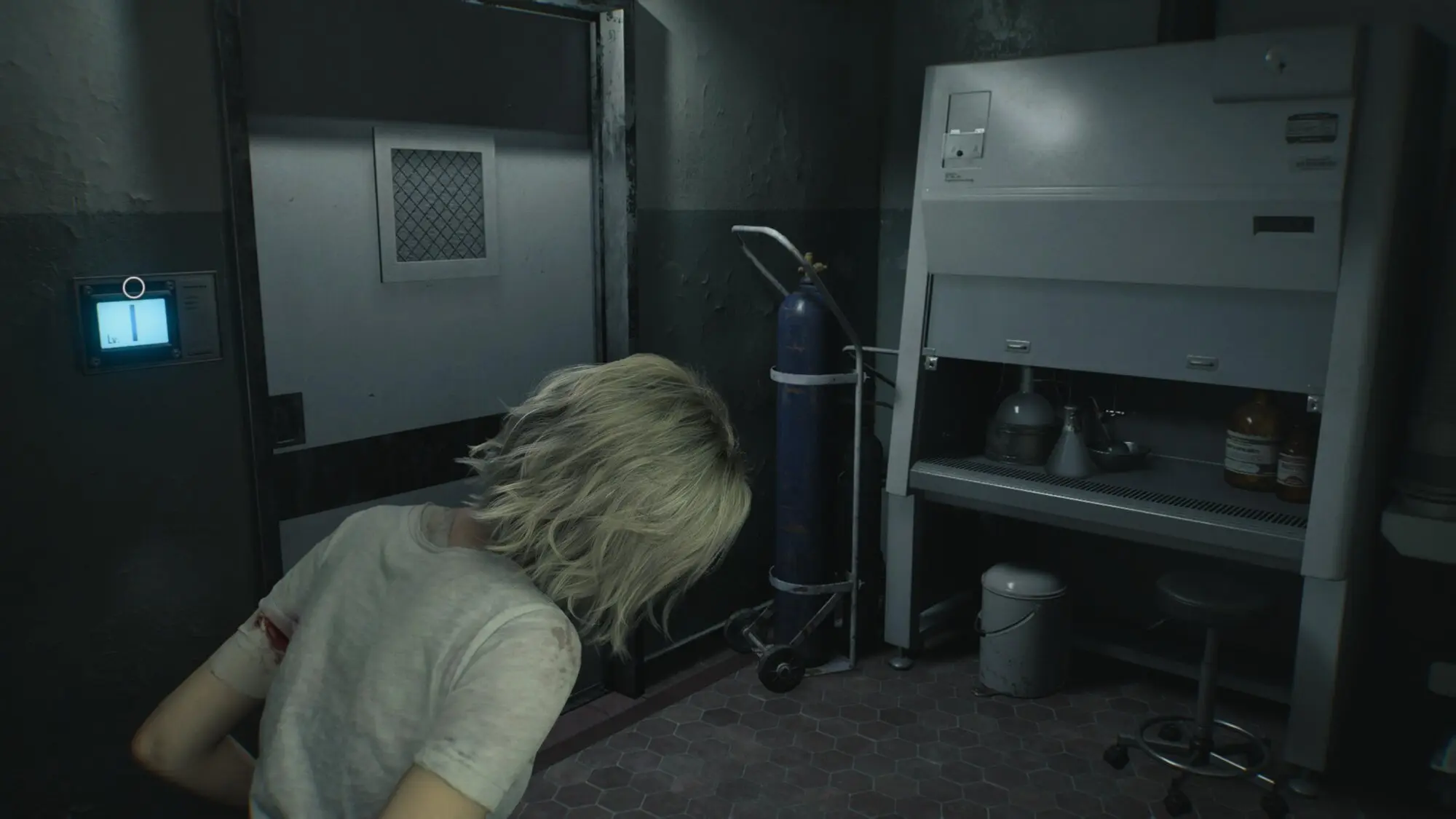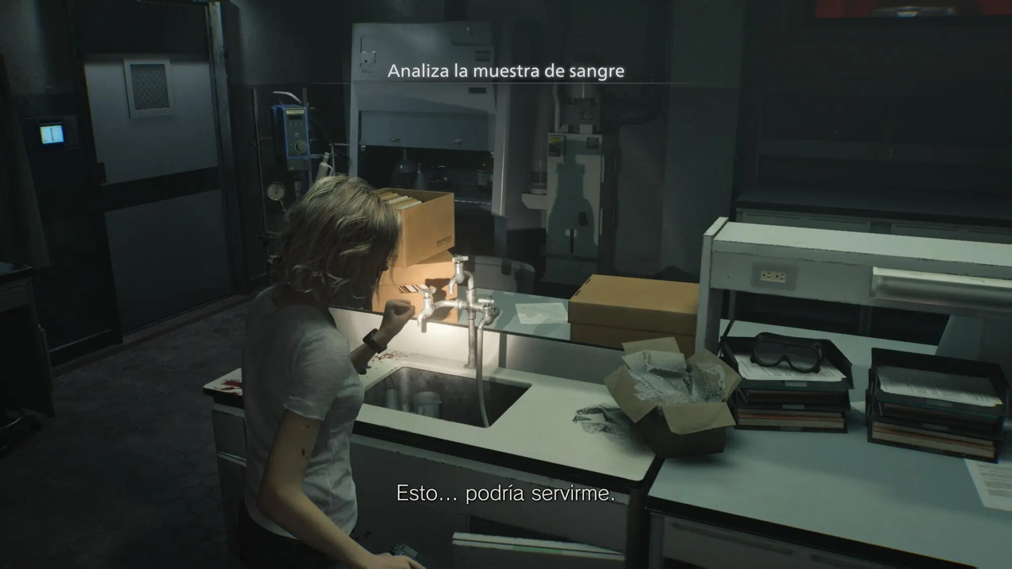 La primera sala de interés en las Unidades hospitalarias tiene en el centro el elemento más importante del sistema de crafting del juego: el microscopio láser. Es un equipo industrial verde y gris, conectado a un ordenador GRAVIDА de pantalla CRT, con un brazo articulado de precisión y varios puertos de inserción. Grace lo mira y lo resume en una sola frase: "Esto... podría servirme."