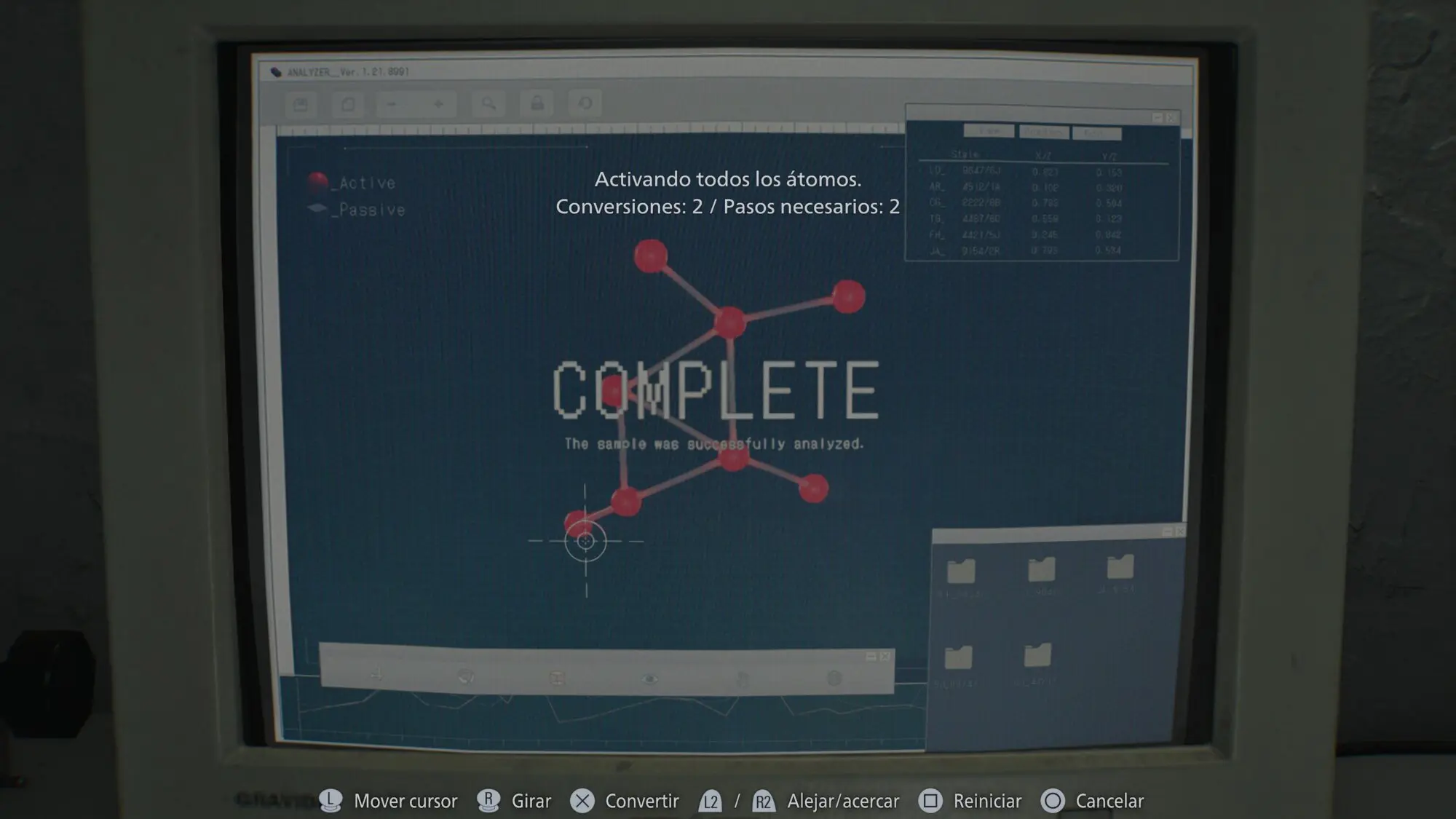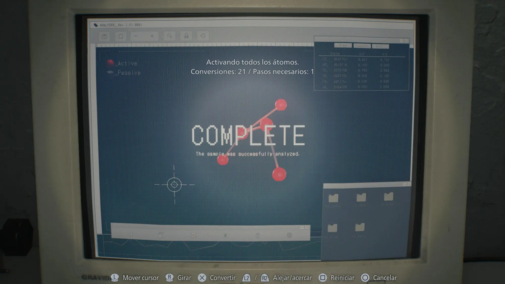 El proceso es el siguiente. Con una Muestra de sangre (desnaturalizada) en el inventario — el cubo morado con el tubo de ensayo que Grace recoge en las unidades hospitalarias — se inserta en el microscopio y se inicia el análisis. La pantalla del ordenador muestra el software ANALYZER Ver. 1.21.8991 procesando la muestra en tiempo real: nodos moleculares en rojo etiquetados como Active y Passive, conversiones calculadas, pasos necesarios. Cuando termina, aparece la pantalla COMPLETE — The sample was successfully analyzed.