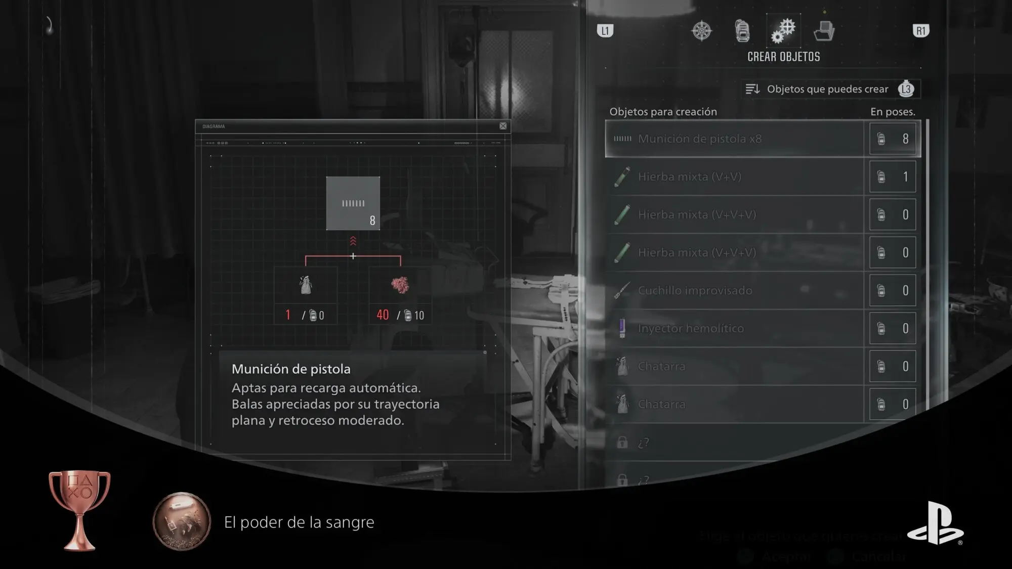 El resultado inmediato es dos diagramas de fabricación desbloqueados: Munición de pistola e Inyector hemolítico. El trofeo de bronce "¡Eureka!" se desbloquea en el momento en que Grace completa el primer análisis. Un segundo trofeo, "El poder de la sangre", aparece al fabricar el primer objeto con los diagramas obtenidos — en este caso, 8 unidades de munición de pistola usando chatarra y sangre como materias primas.