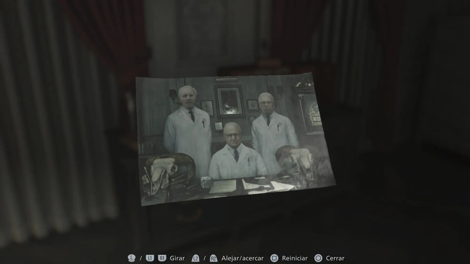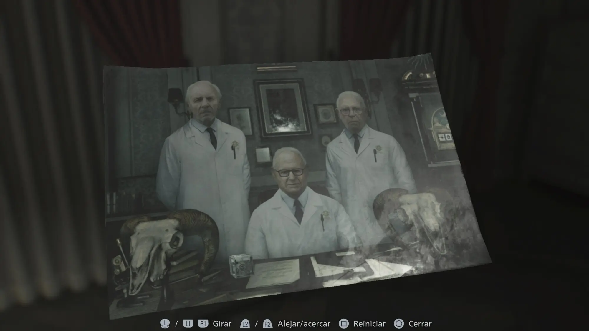 Sobre la mesa hay dos fotografías que Grace puede examinar. La primera es una fotografía grupal — blanco y negro, formato retrato de equipo, tres hombres en bata blanca posando en lo que parece una oficina de dirección. Cráneos animales decorativos a ambos lados del escritorio central. El hombre sentado en el centro lleva gafas y placa de identificación. No sonríen.