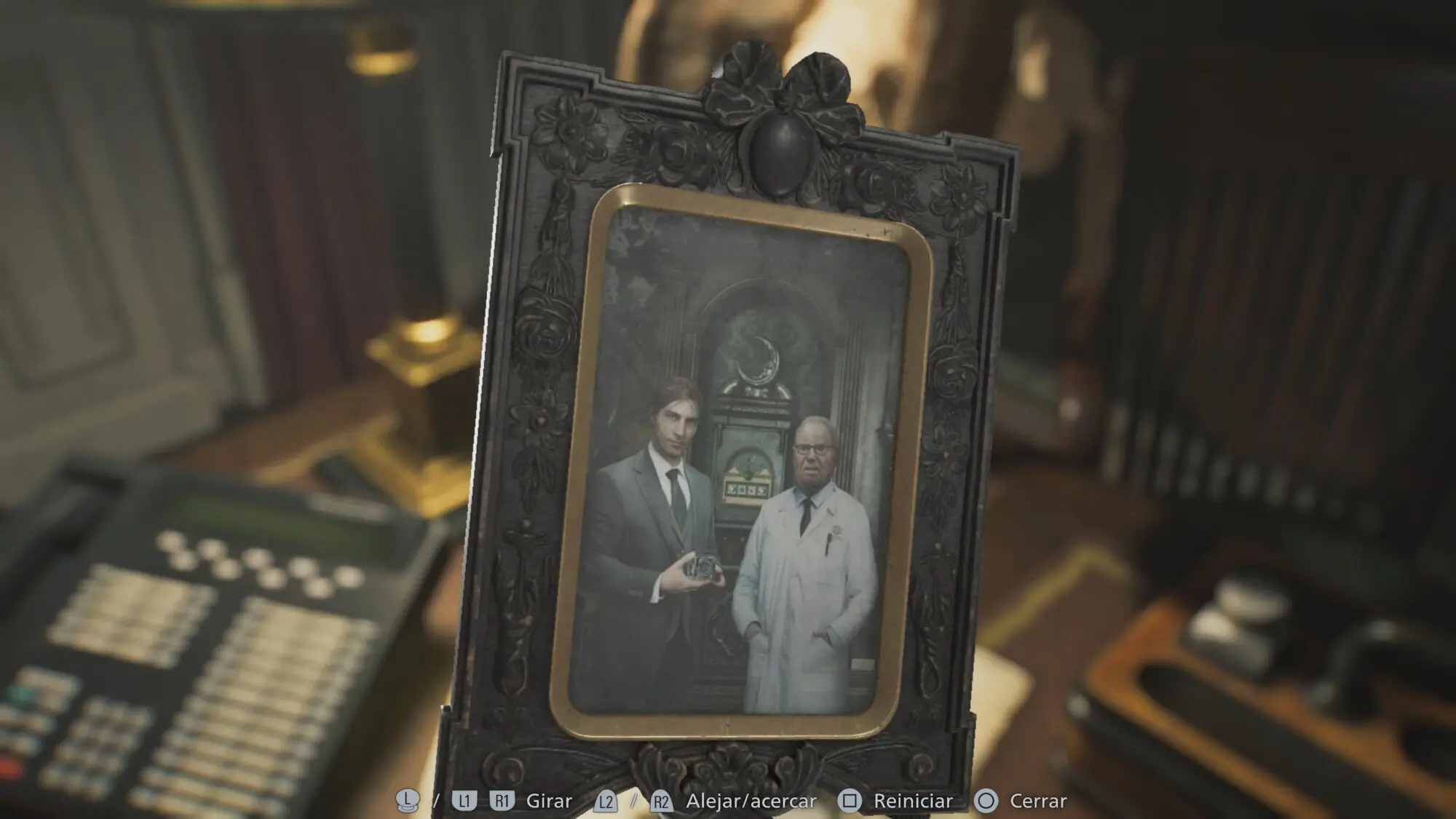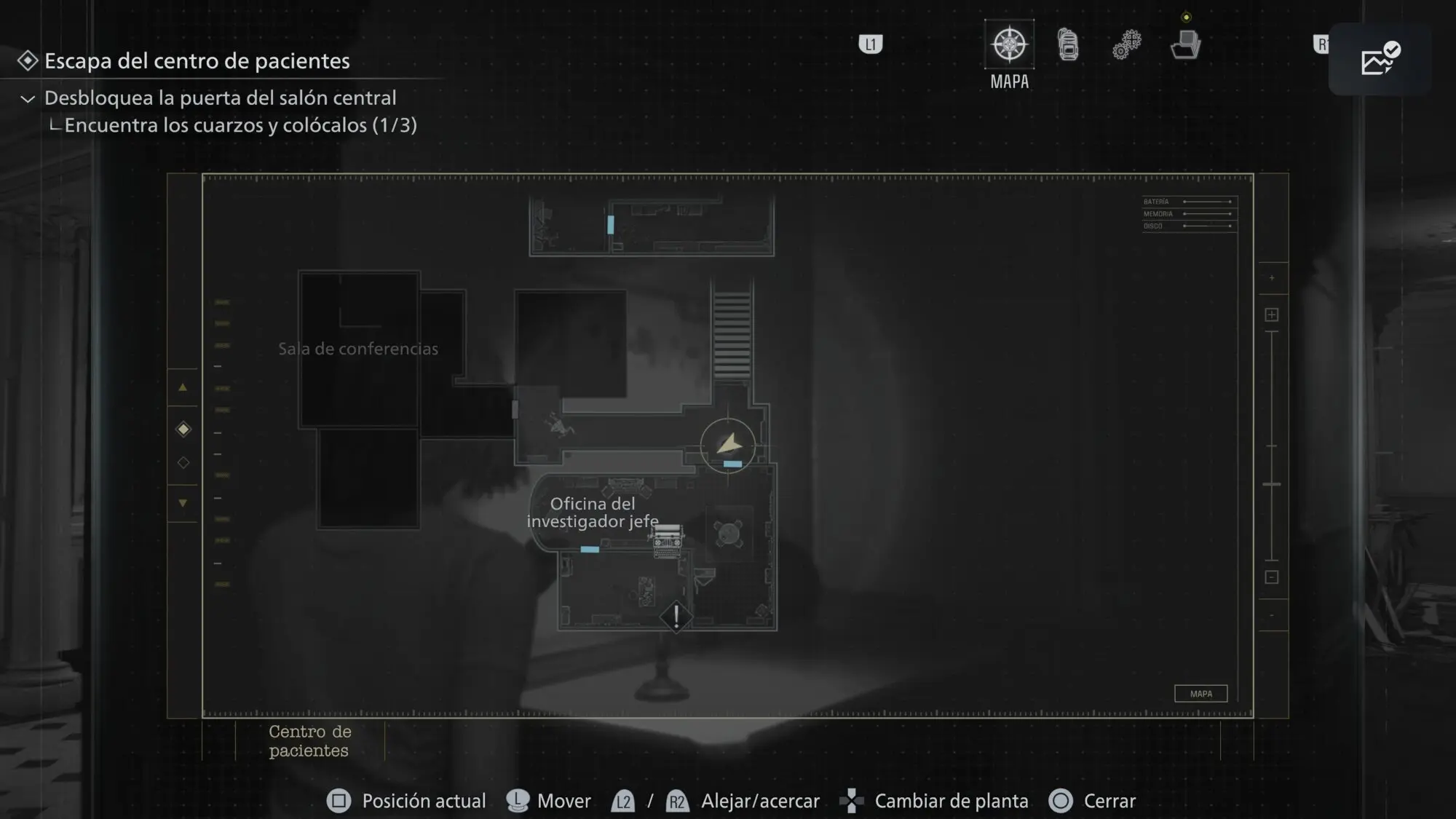 El minimapa de las Unidades hospitalarias señala una sala específica: la Oficina del investigador jefe, accesible desde el pasillo principal. Es una oficina de aspecto más convencional que los laboratorios — mesa de madera, teléfono analógico, luz de escritorio cálida — pero lo que hay dentro no tiene nada de convencional.