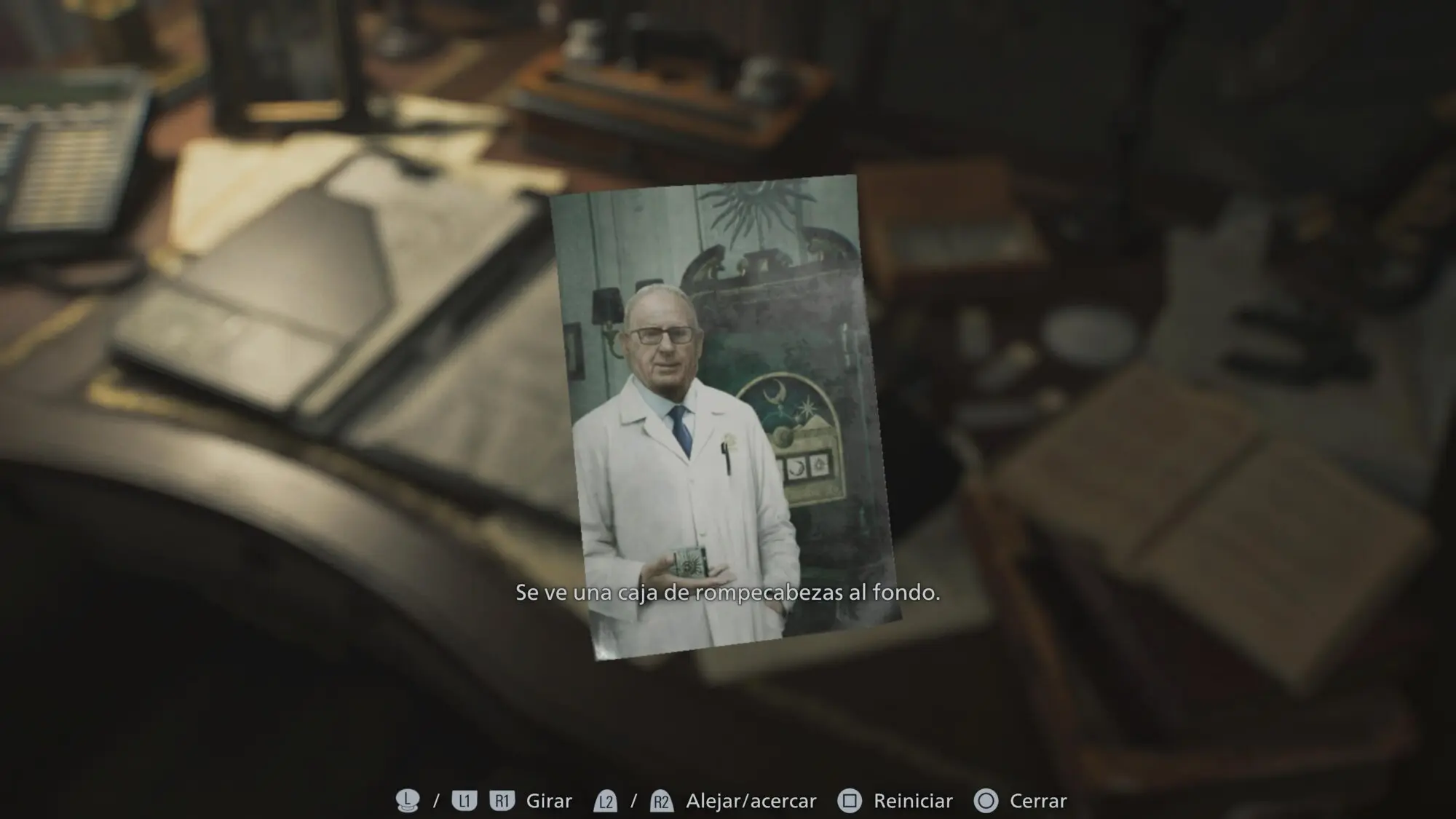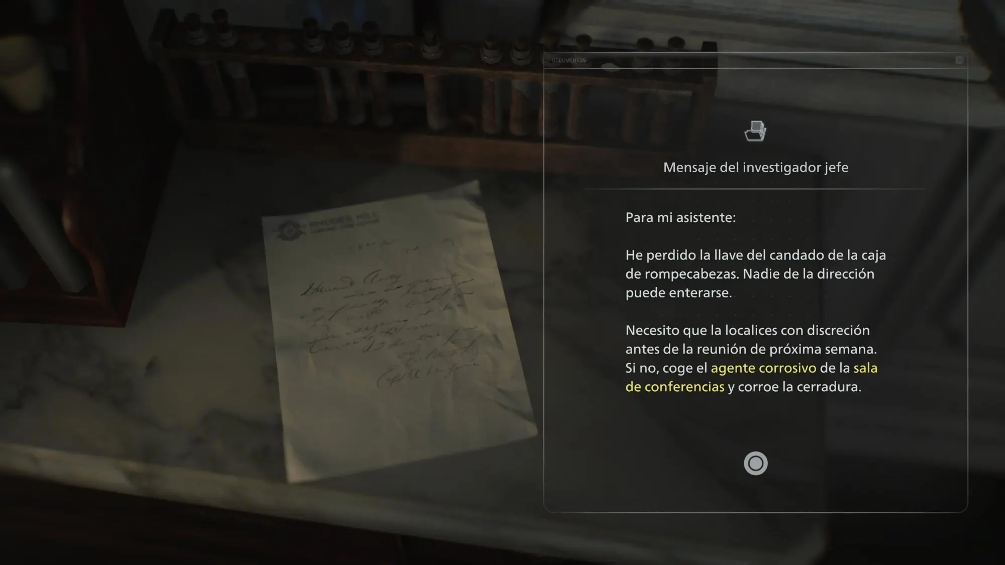 El documento más importante de la oficina es el Mensaje del investigador jefe — una nota manuscrita en papel membretado de Rhodes Hill. Va dirigida a su asistente y el tono mezcla urgencia con paranoia: "He perdido la llave del candado de la caja de rompecabezas. Nadie de la dirección puede enterarse." La segunda parte da la alternativa: "Necesito que la localices con discreción antes de la reunión de próxima semana. Si no, coge el agente corrosivo de la sala de conferencias y corroe la cerradura."