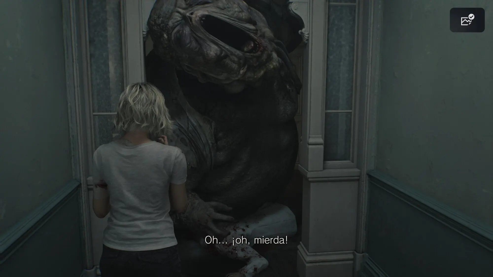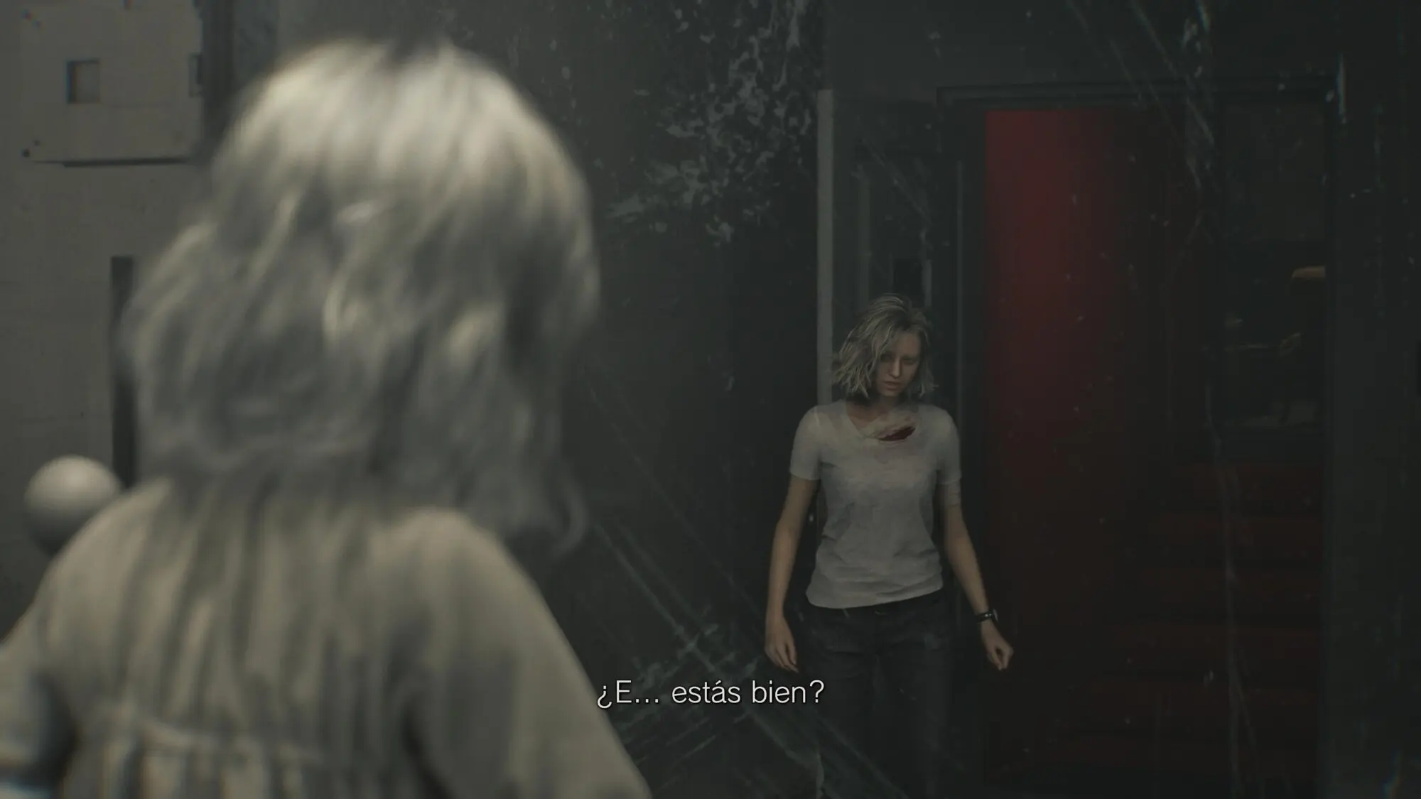 La niña no ataca. Pregunta: "¿Hay alguien ahí?" y después, girando lentamente la cabeza hacia donde está Grace: "¿Quién eres?" No la ve. La siente. El juego no explica qué es ni qué le pasó. Grace tampoco lo sabe. La reacción de Grace — espalda contra la pared, iluminada por la luz roja de la habitación contigua, ojos abiertos — lo dice todo sin necesidad de diálogo.