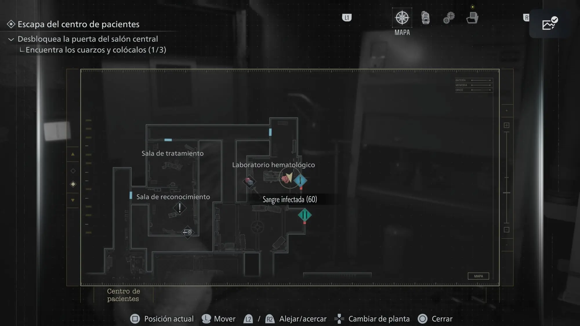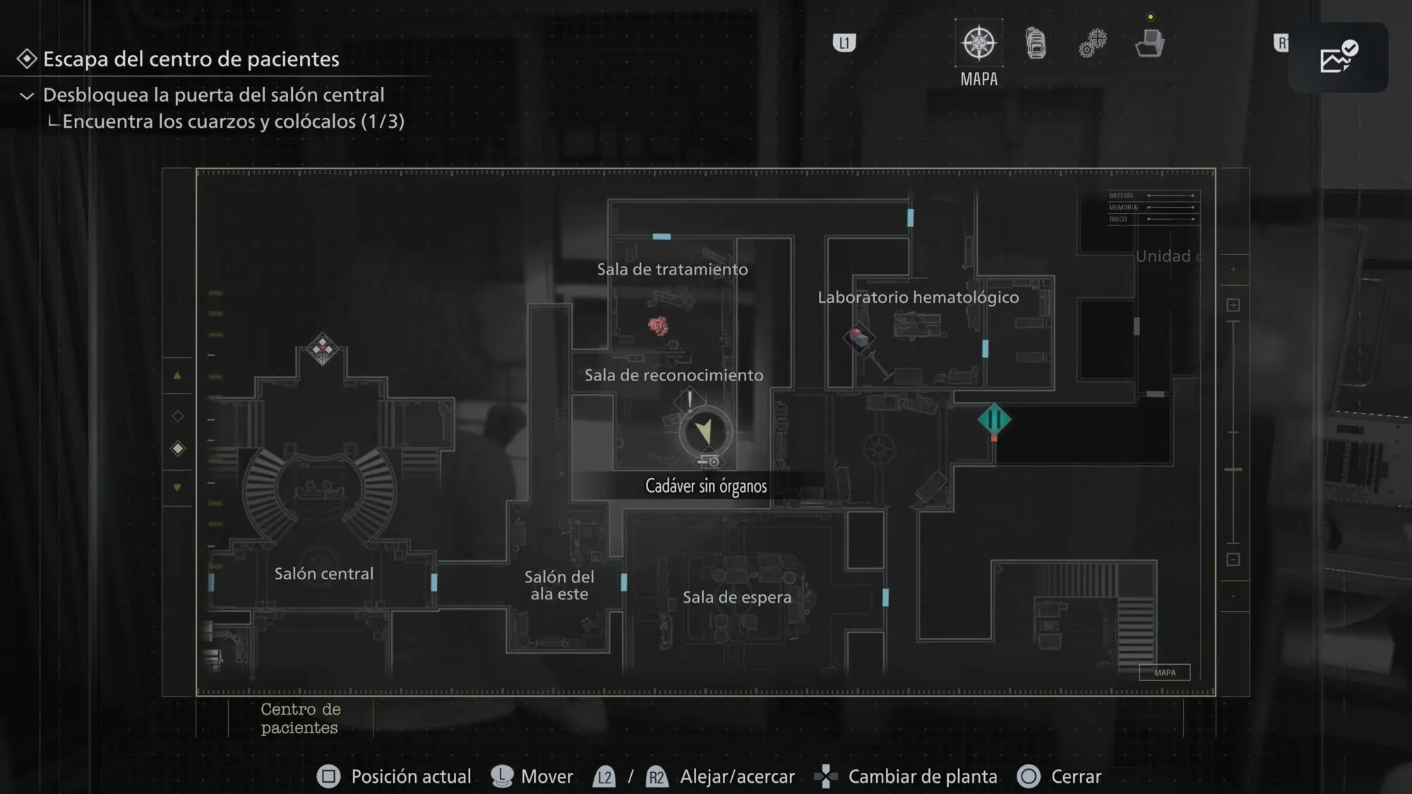 El minimapa de la planta principal del Centro de pacientes (imagen 8) es el más completo hasta ahora. Confirma la geografía completa de este nivel: Sala de tratamiento al norte, Laboratorio hematológico al noreste, Sala de reconocimiento al centro — con Grace posicionada exactamente sobre el marcador de "Cadáver sin órganos" — Salón central al oeste con su planta circular visible, Salón del ala este y Sala de espera al sur. El objetivo en este mapa muestra aún 1/3, situando temporalmente esta exploración antes de colocar el Cuarzo solar.