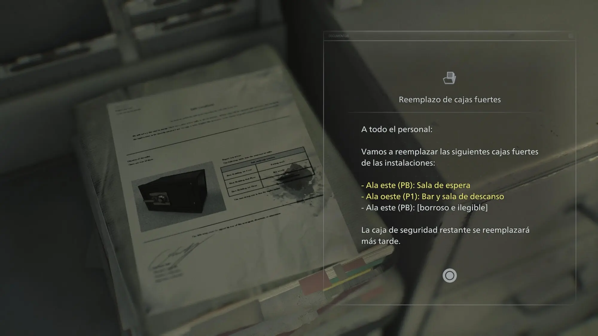El documento marca en amarillo dos pistas con uso directo en el juego: agente corrosivo y sala de conferencias. Son las dos palabras que Grace va a necesitar recordar.