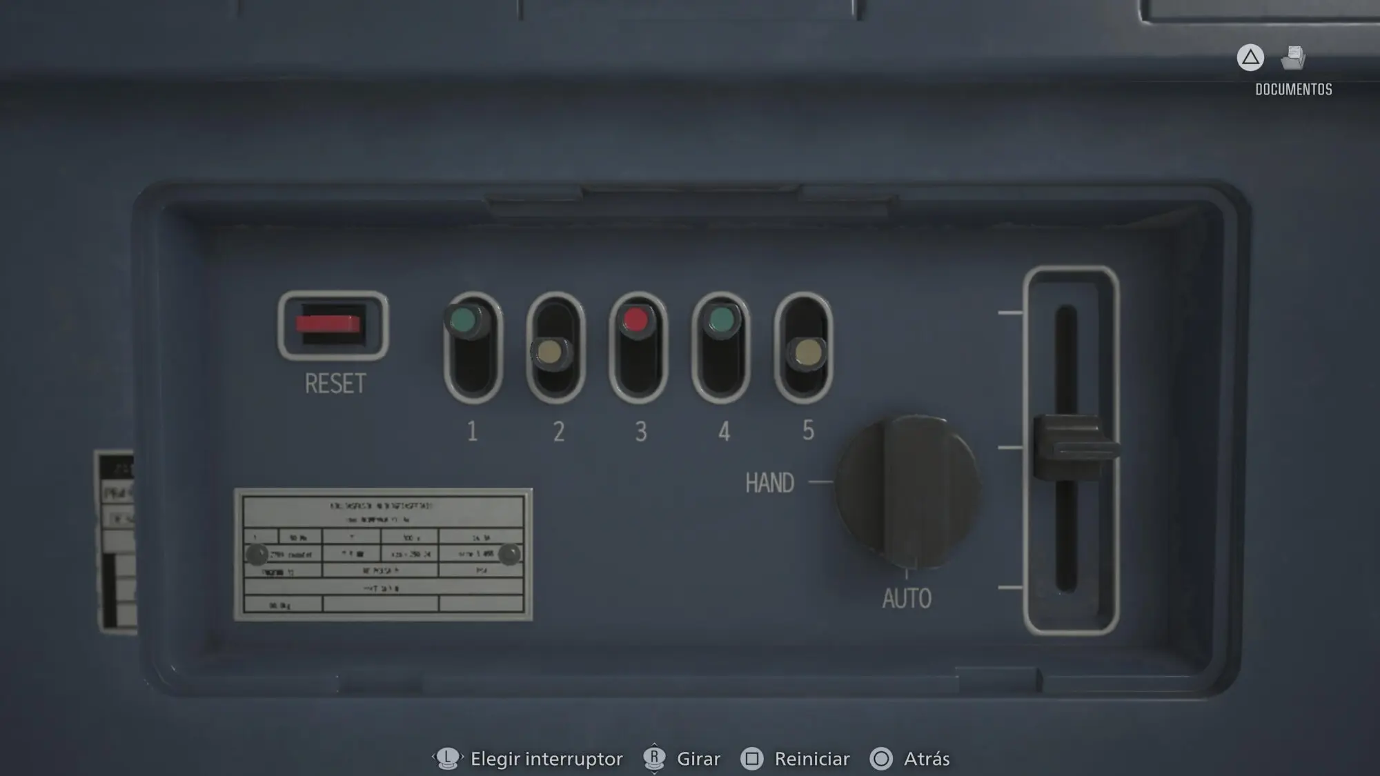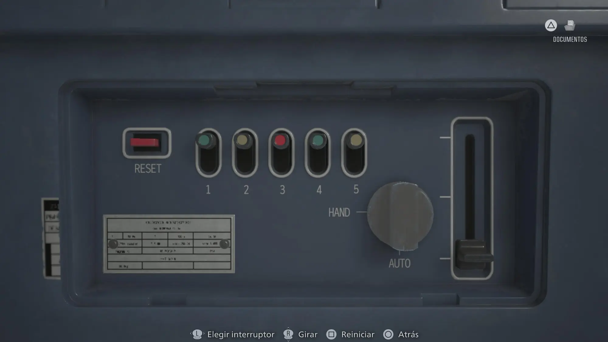 El panel de control está empotrado en la misma zona — una consola industrial gris azulado con cinco interruptores numerados del 1 al 5, botón RESET a la izquierda, selector HAND/AUTO central y palanca deslizante a la derecha. El estado inicial visible muestra: interruptor 1 en verde, 2 en ámbar, 3 en rojo, 4 en verde, 5 en ámbar. El selector en HAND, palanca en posición media. El recordatorio △ para consultar Documentos está activo — el juego confirma que la solución está en el diagrama del cuaderno.