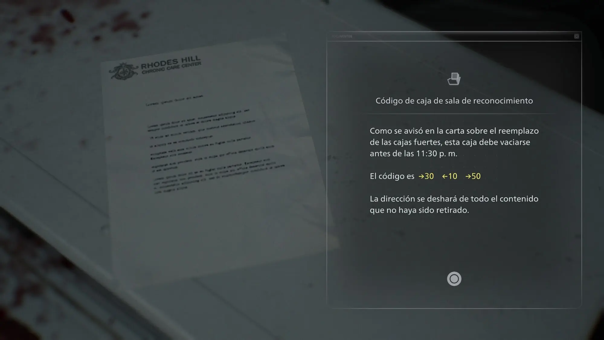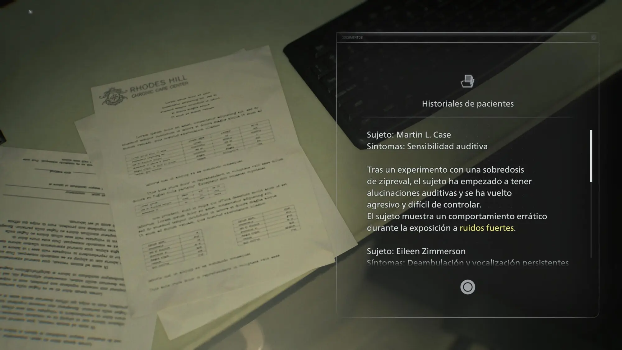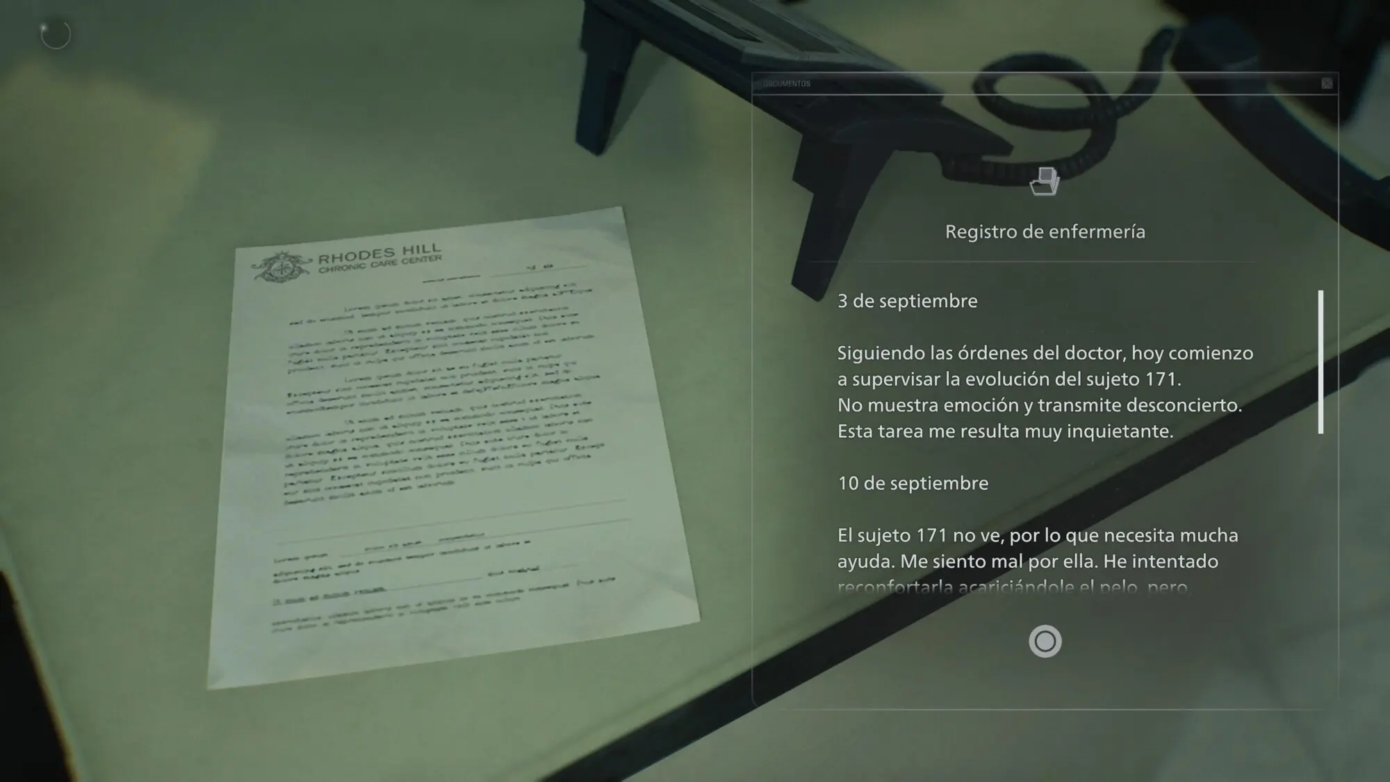 | Registro de enfermería | Oficina del jefe de seguridad | Emily = Sujeto 171. Ciega. Supervisada por órdenes médicas desde septiembre 2026 |