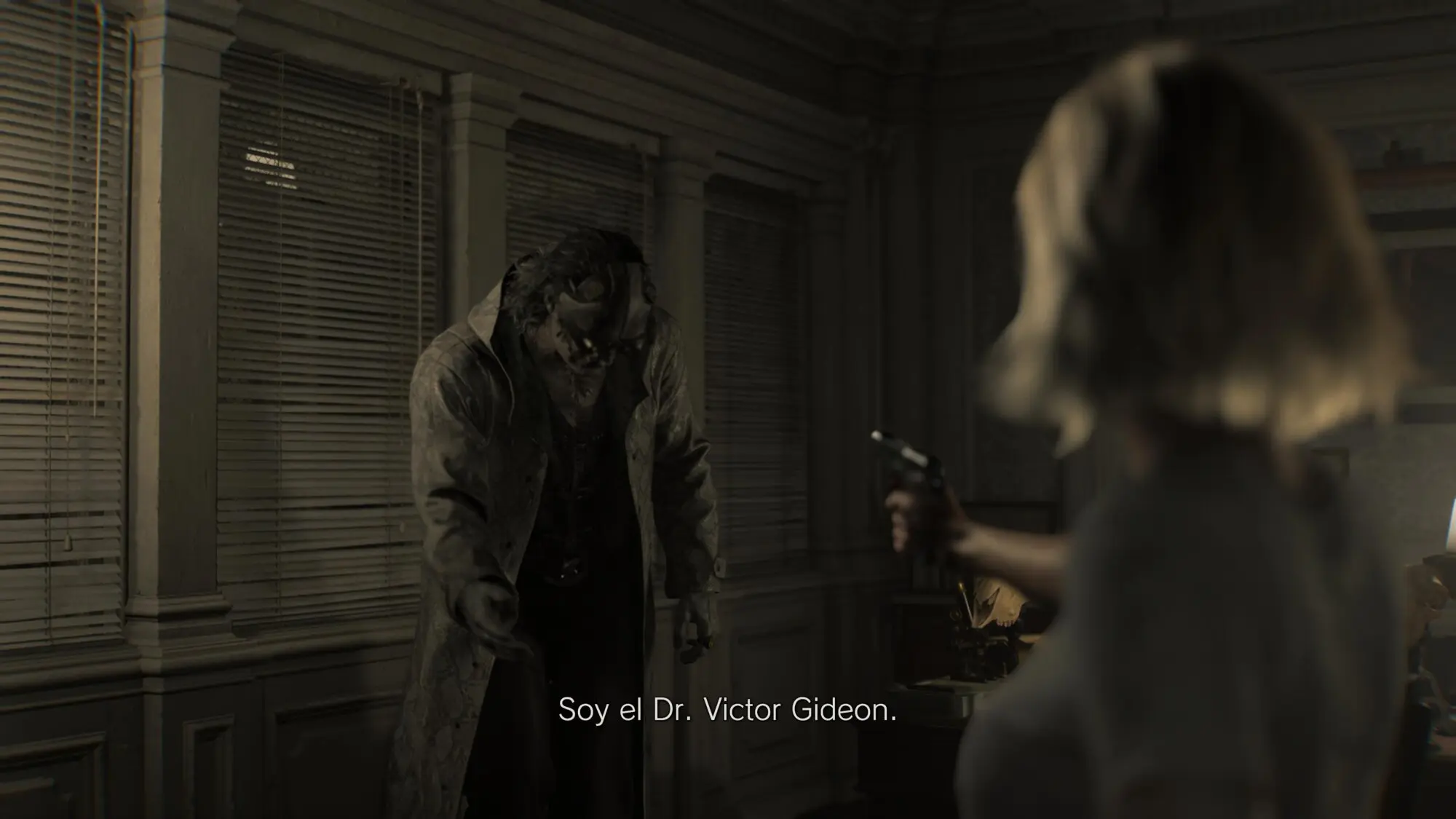 El tramo de Grace en el Salón central incluye un momento que el juego maneja con mucha frialdad y que por eso resulta más perturbador que la mayoría de los encuentros con infectados. En una de las habitaciones del interior, Grace descubre a una niña sentada en una cama. Vestido blanco largo con mangas. Cabello gris claro, liso, con flequillo. Y los ojos completamente blancos — sin pupila, sin iris, completamente desaturados.