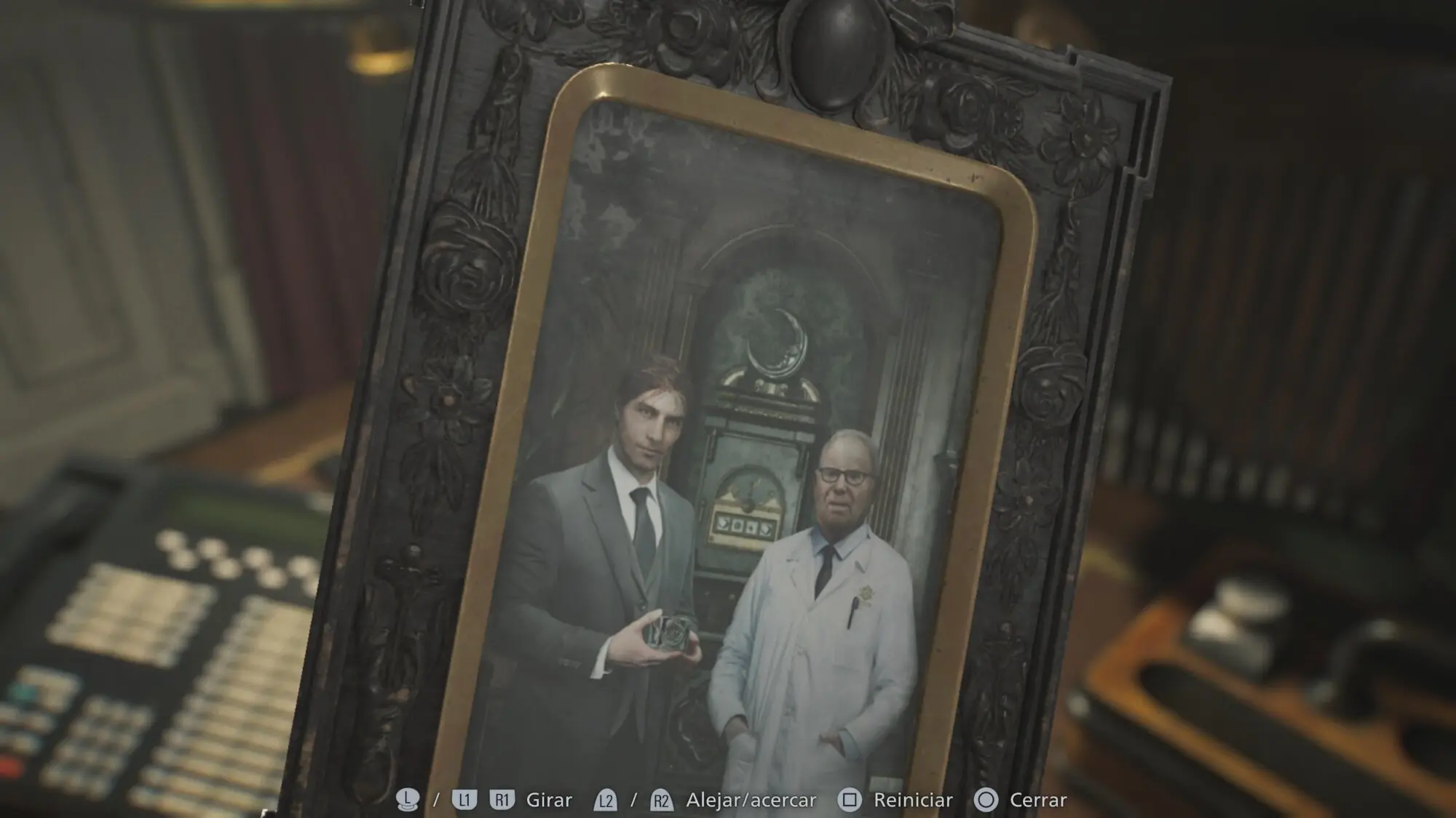 La tercera imagen es una fotografía suelta más reveladora: el investigador jefe solo, de pie frente a la caja fuerte astronómica vista de cerca — luna, sol y estrella en el panel superior perfectamente visibles. El juego la etiqueta con una nota de observación al pie: "Se ve una caja de rompecabezas al fondo." No es la caja fuerte del ala oeste. Es otra. O es la misma vista desde otro ángulo.