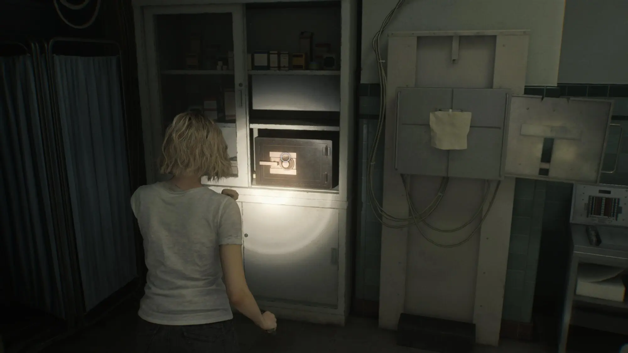 La caja fuerte que el documento de la Sala de conferencias señalaba como pendiente está localizada dentro de un armario médico blanco de dos cuerpos, encajada en la balda central — una caja de seguridad metálica oscura con dial giratorio circular y palanca lateral. El código ya lo teníamos: →30 ←10 →50.