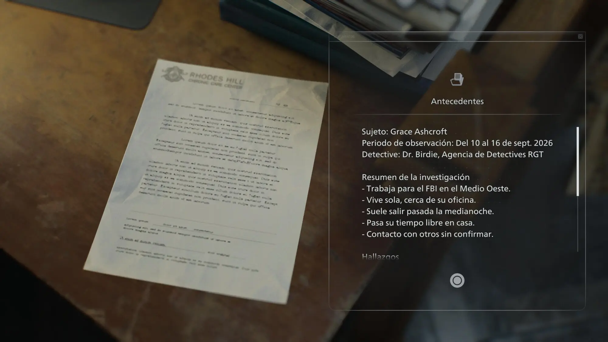 El documento se titula "Antecedentes" y está emitido por la Agencia de Detectives RGT, firmado por el Dr. Birdie. El sujeto investigado es Grace Ashcroft. El periodo de observación: del 10 al 16 de septiembre de 2026. El resumen enumera cinco puntos: trabaja para el FBI en el Medio Oeste, vive sola cerca de su oficina, suele salir pasada la medianoche, pasa su tiempo libre en casa, contacto con otras personas sin confirmar. La sección "Hallazgos" queda cortada en la captura.