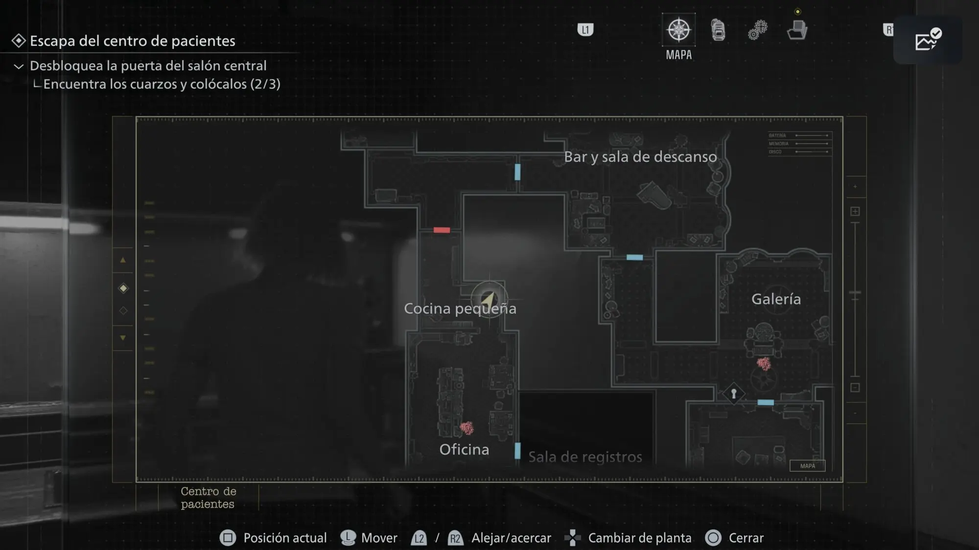 Bar y sala de descanso, en el ángulo noreste de esta planta del Centro de pacientes. Se suma a la geografía ya conocida de Cocina pequeña, Oficina, Sala de registros, Galería y Oficina del presidente. Un marcador rojo indica una puerta bloqueada al norte — posiblemente la entrada al bar — y el marcador cian en la zona central señala un objeto por recoger. Grace está posicionada en la Cocina pequeña, el objetivo sigue en 2/3.