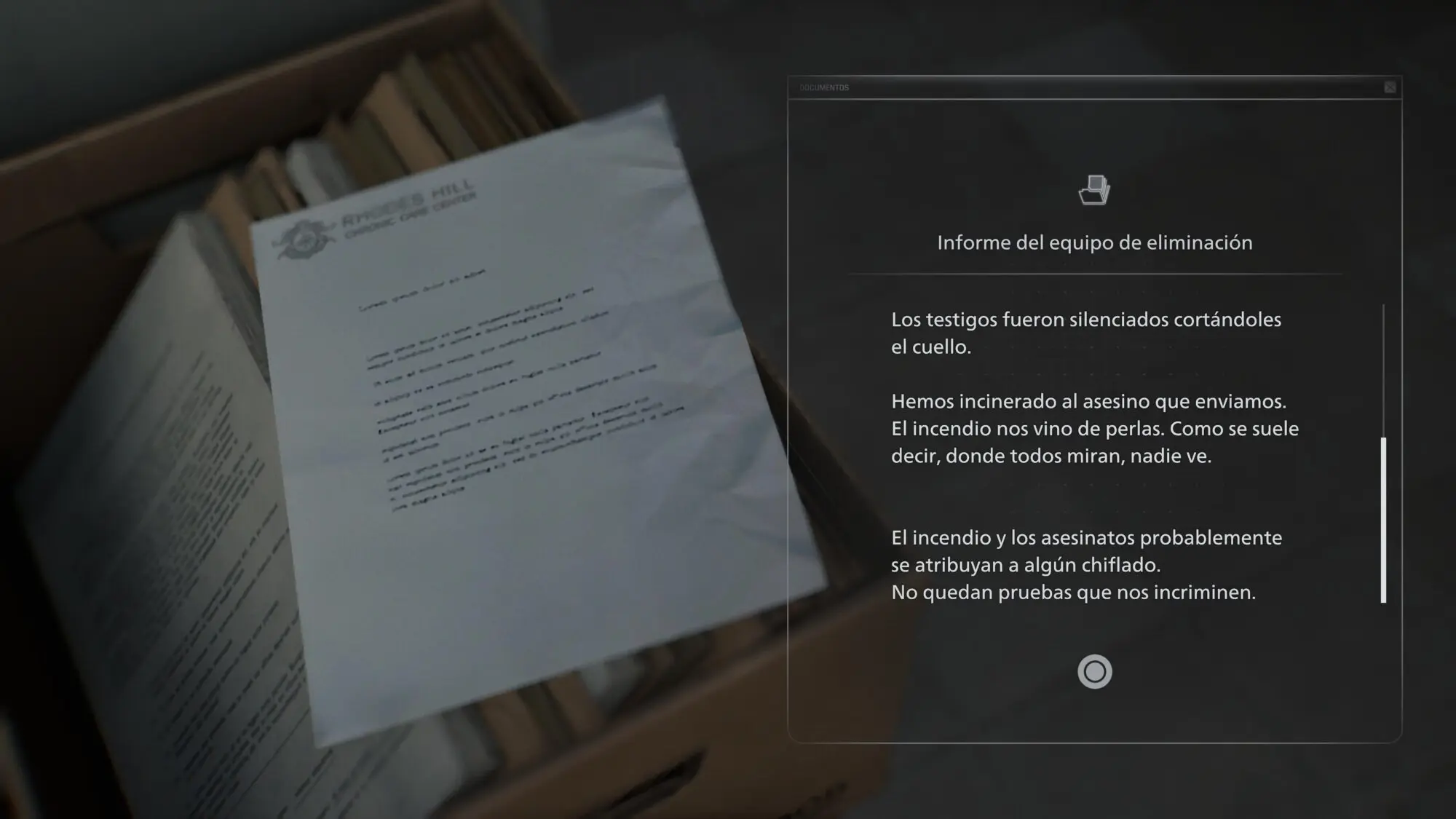En algún cajón o caja de la Sala de registros, entre archivos de personal y expedientes administrativos, Grace encuentra el documento más explícito del juego hasta ahora. El papel tiene membrete de Rhodes Hill Chronic Care Center y se titula "Informe del equipo de eliminación". El contenido, sin preámbulos: