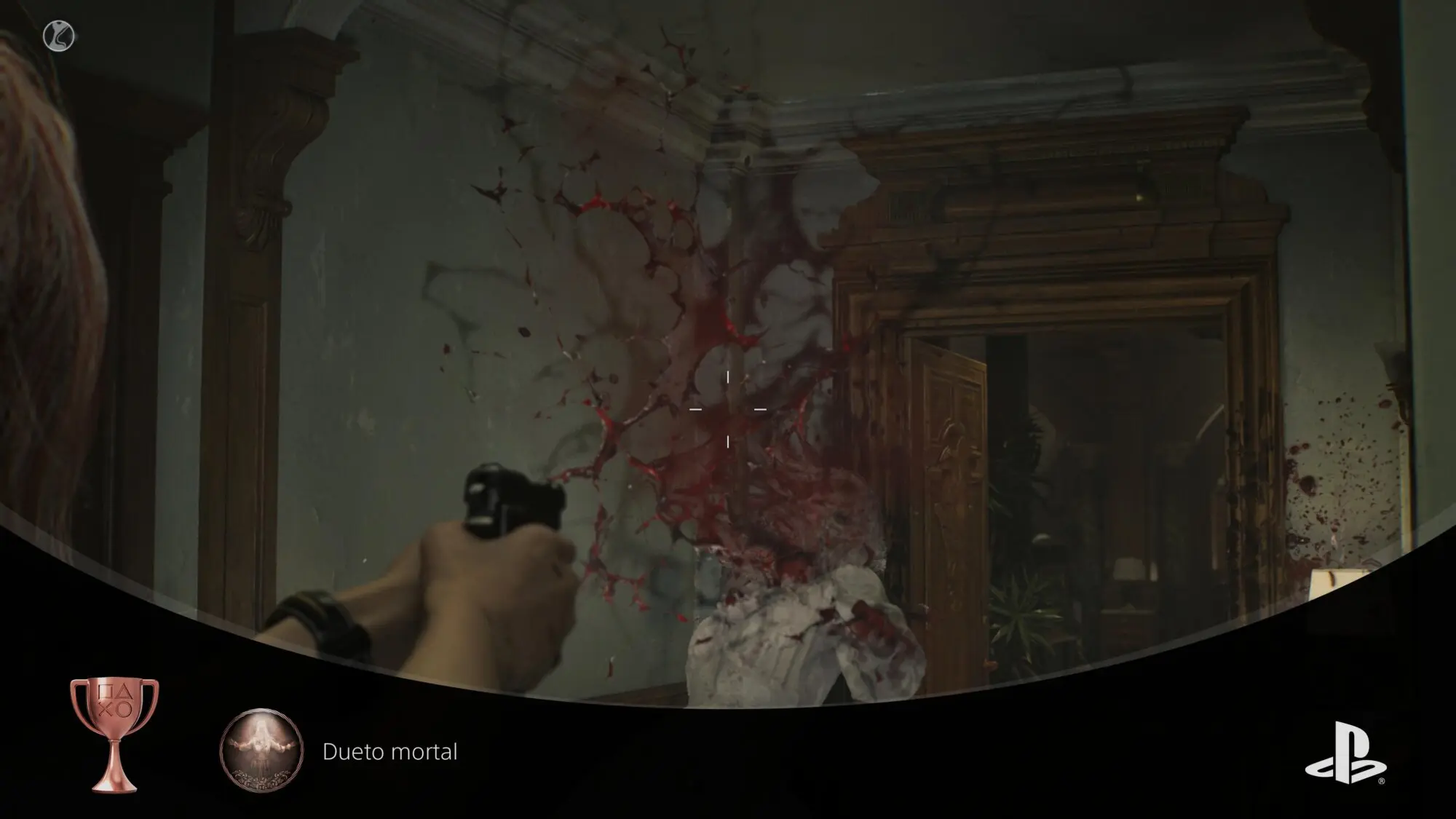 En esta zona si conseguimos matar a las dos infectadas que cantan conseguiremos el trofeo de bronce "Dueto mortal" — icono de dos figuras enfrentadas — mientras Grace remata a un infectado con la pistola en primera persona, sangre salpicando la pared blanca.