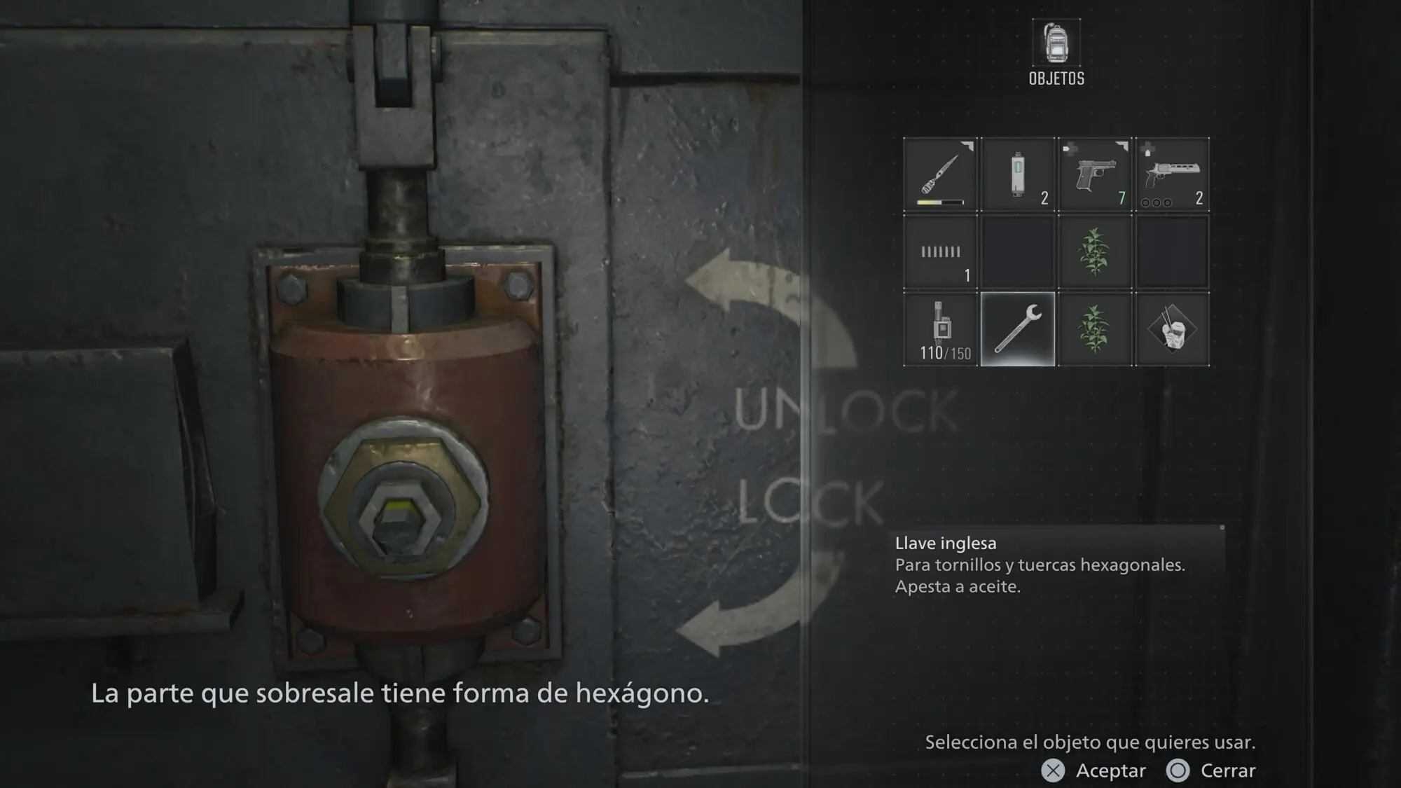 | Cerrojo hexagonal — Llave inglesa | Puerta en zona de cocinas | Primer uso directo de la Llave inglesa que Grace lleva desde el inicio |