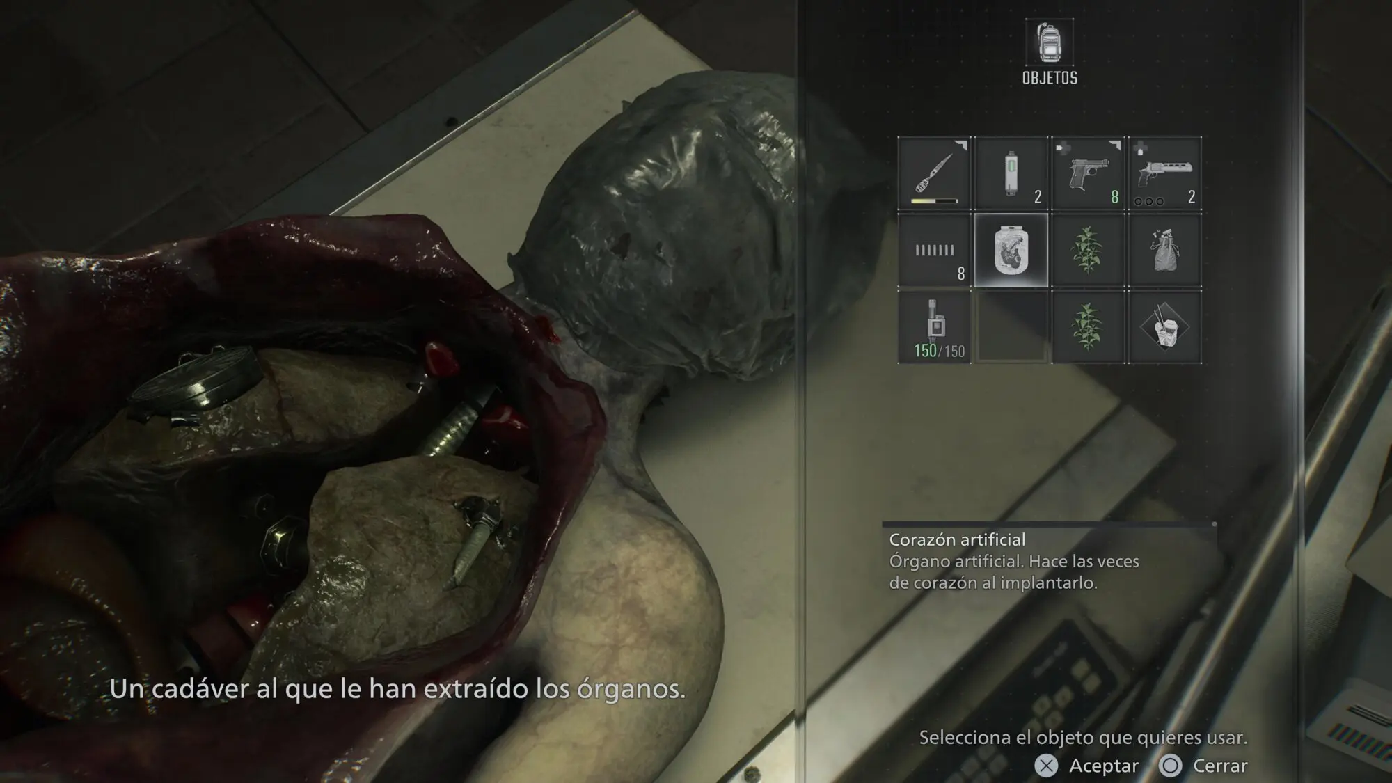 Nos vamos directos al cadáver sin organos del Ala Este donde Grace usará el Corazón artificial frente a lo que el juego describe en pantalla como: "Un cadáver al que le han extraído los órganos." El cadáver es visible en primer plano: un cuerpo humano con la cavidad torácica abierta, órganos de aspecto metálico y tornillos visibles en el interior — una intervención que mezcla cirugía con implantación mecánica. La descripción del objeto confirma su función: "Órgano artificial. Hace las veces de corazón al implantarlo."