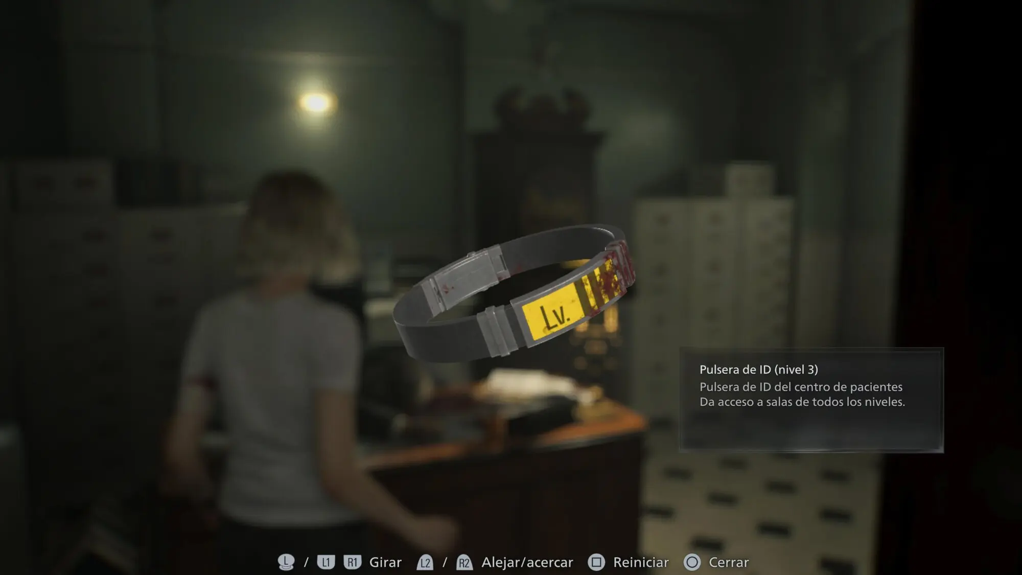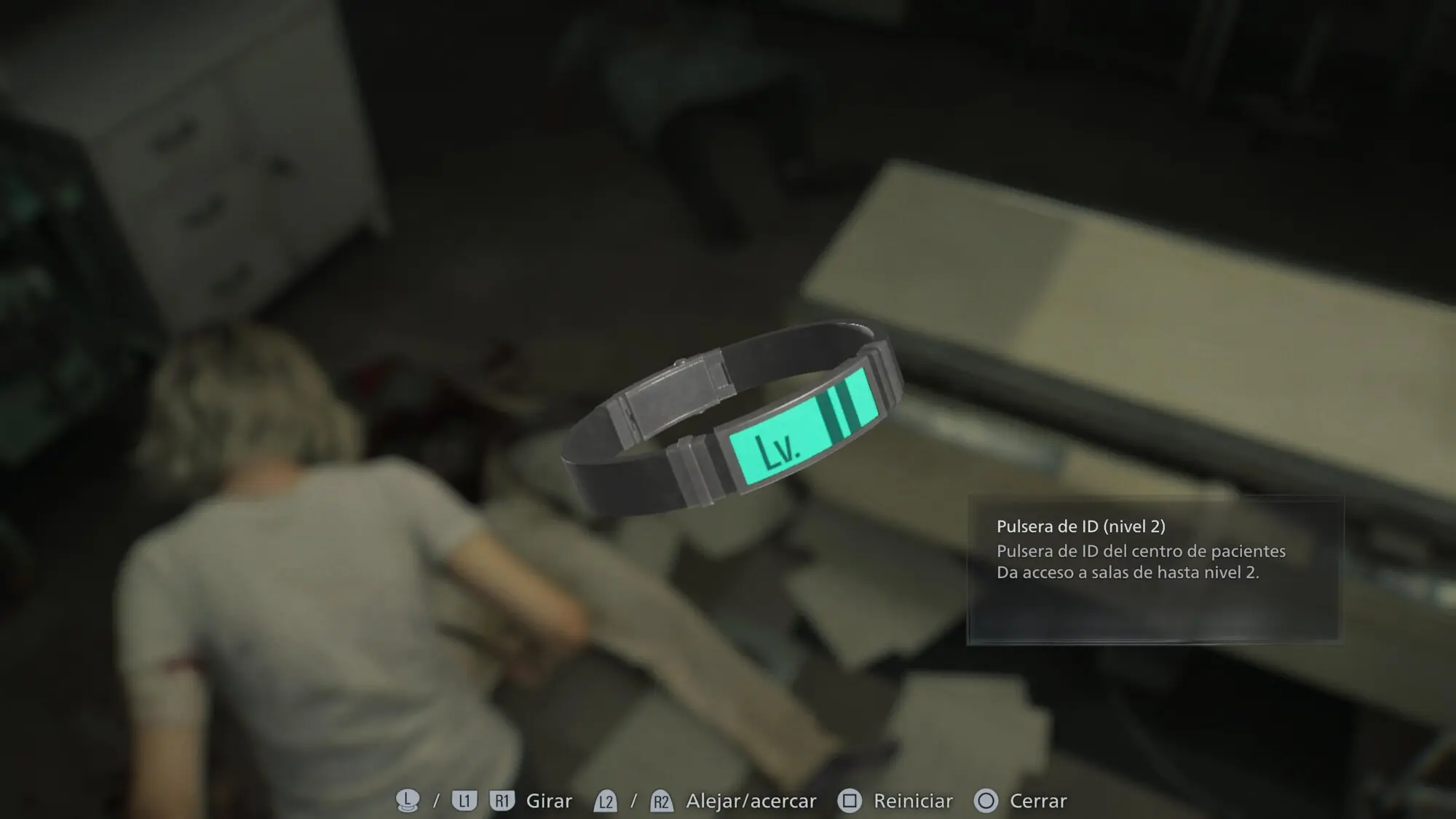 El segundo objeto es el de mayor impacto en la exploración: la Pulsera de ID (nivel 1) — una pulsera negra con pantalla azul que muestra "Lv." en el display. Su función es tan directa como su diseño: "Da acceso a salas de hasta nivel 1." Rhodes Hill tiene un sistema de control de acceso por niveles integrado en su infraestructura hospitalaria, y esta pulsera es el primer peldaño. Grace la encuentra en el cuerpo de alguien que ya no la necesita.