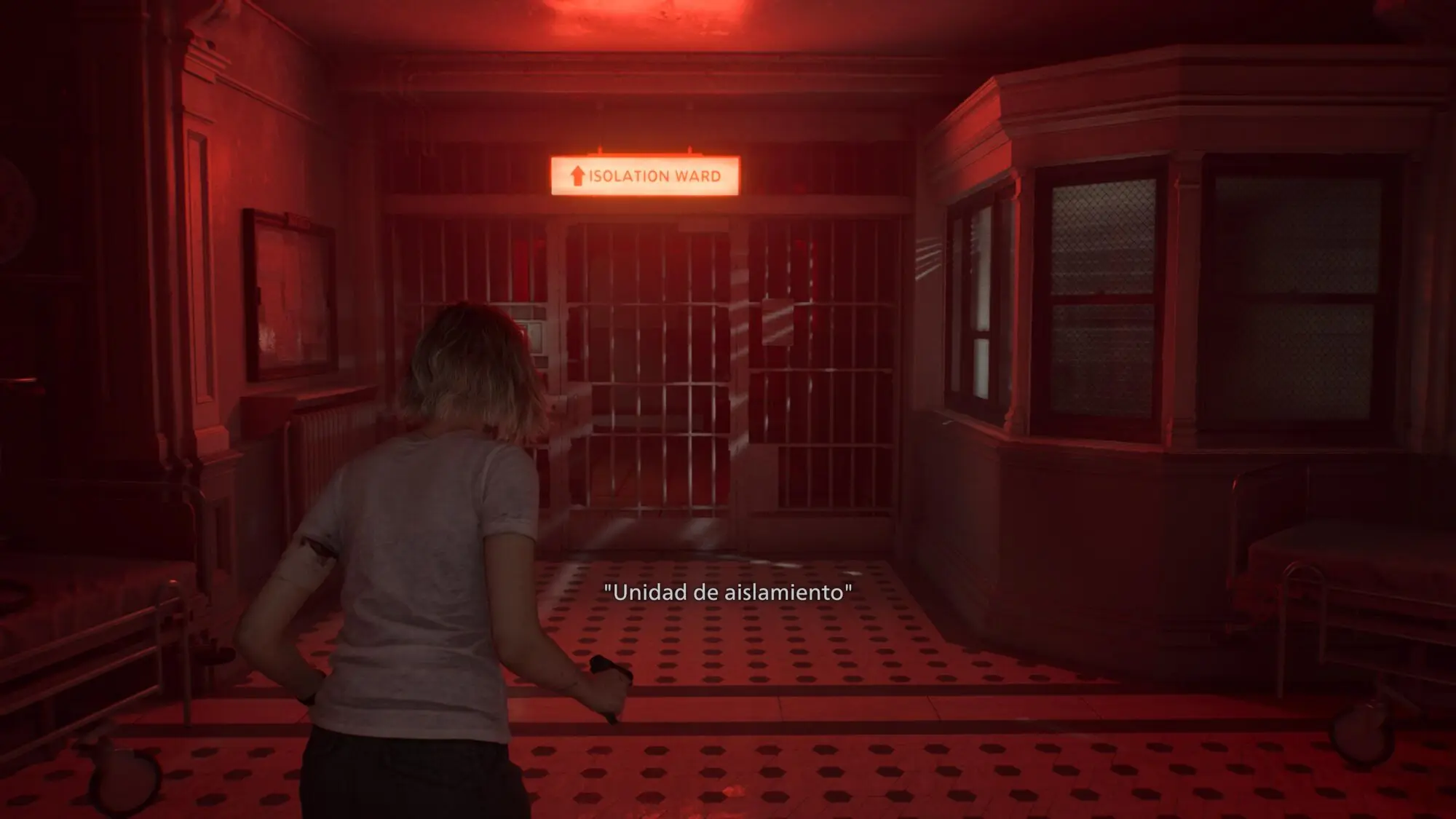 | Unidad de aislamiento (ISOLATION WARD) | Pasillo en rojo de emergencia | Nueva zona — luz roja total, reja de barrotes, destino del siguiente tramo |