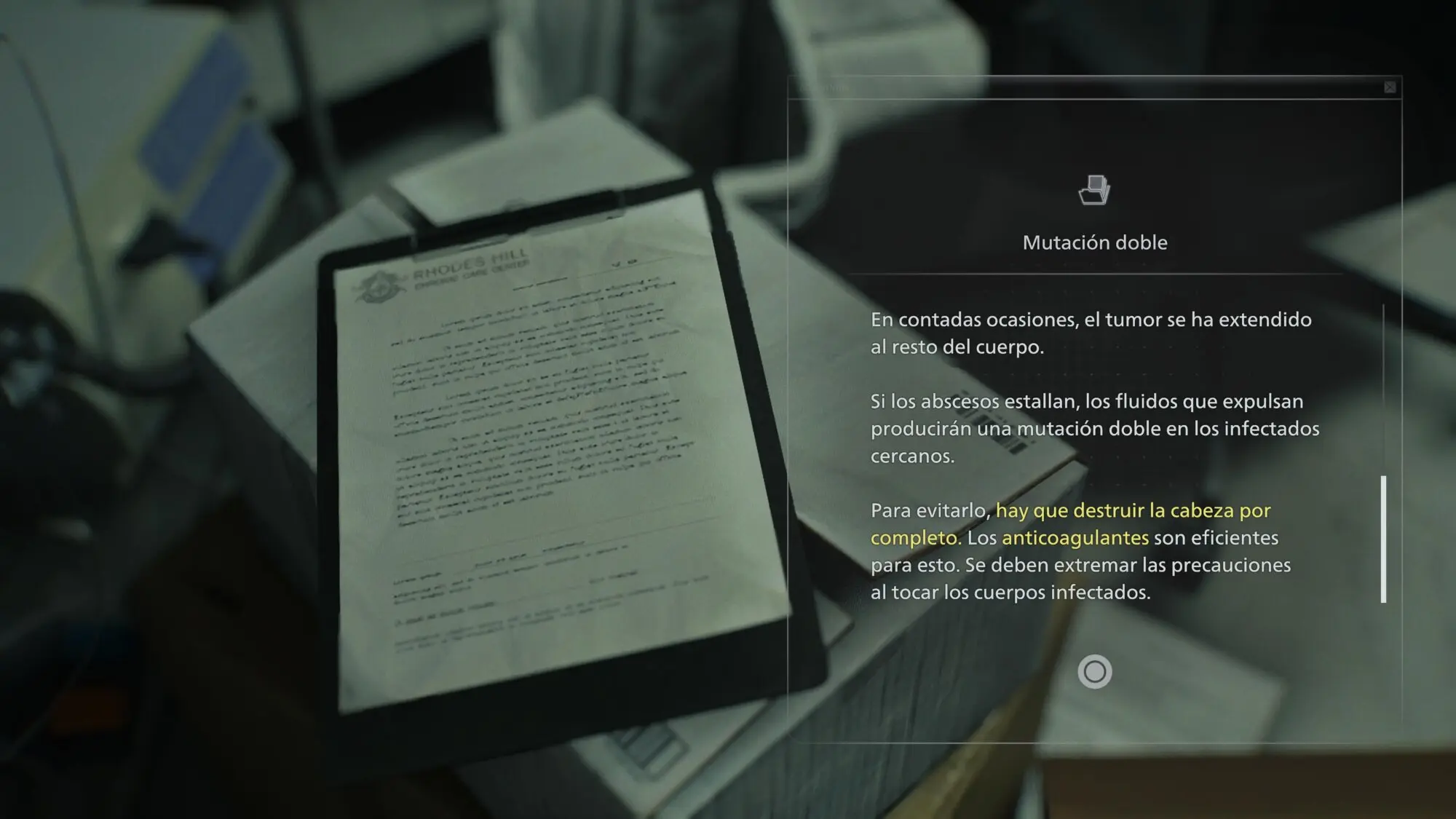 | Documento "Mutación doble" | Oficina del jefe de seguridad | ⚠️ Peligro crítico: destruir la cabeza para evitar infección en cadena. Usar anticoagulantes |