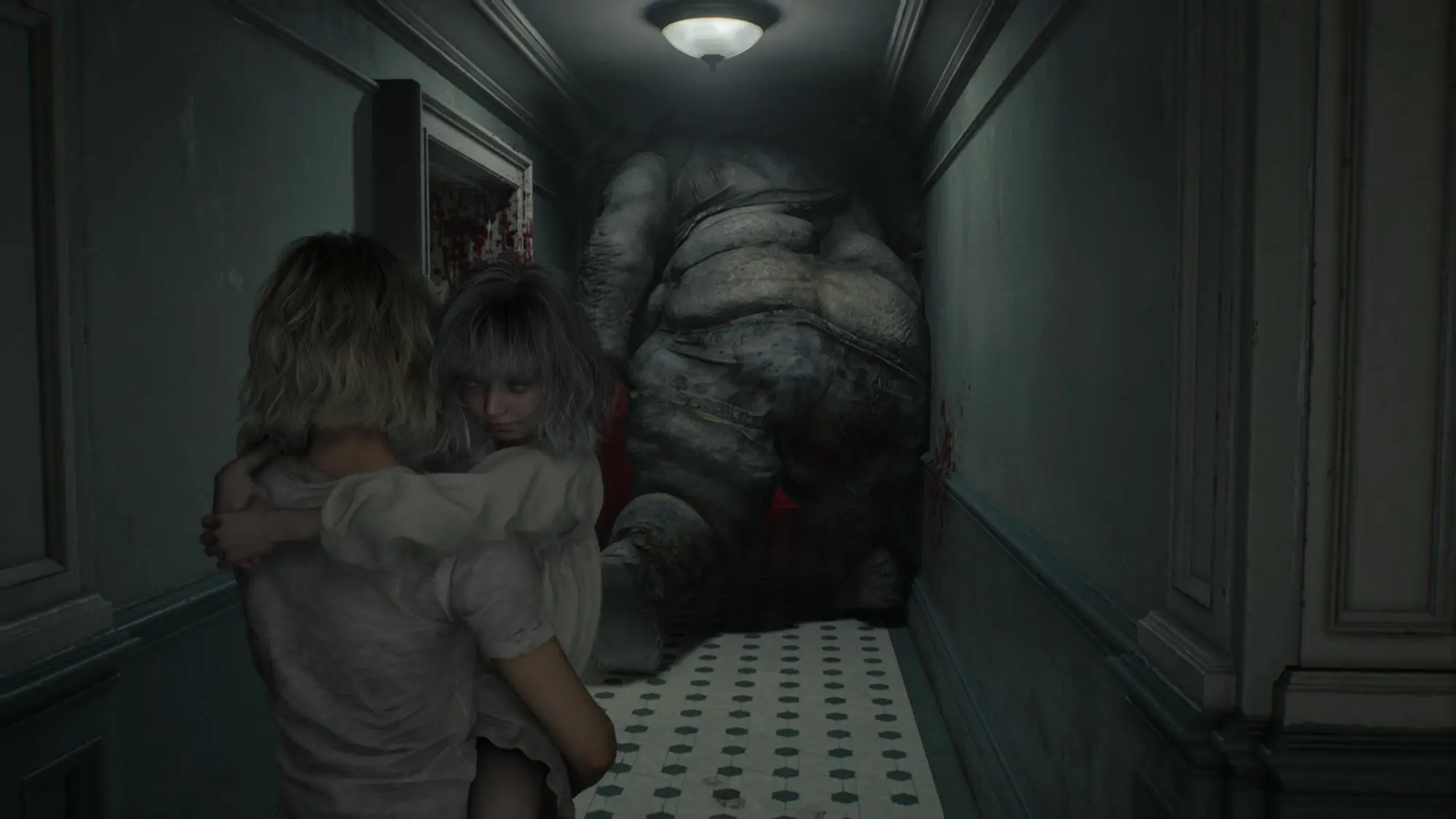 Es el momento de mayor tensión del tramo. Grace carga con Emily en brazos en un pasillo estrecho de paredes verde pálido y suelo de mosaico en blanco y negro. Al fondo del pasillo, bloqueando completamente el paso, hay una criatura de proporciones monstruosas — un cuerpo humano hipertrofiado hasta límites grotescos, con la piel de un gris oscuro y textura rugosa, tan ancho que ocupa de pared a pared. Es el primer enemigo de esta categoría en el Centro de pacientes: un infectado con mutación masiva de tejidos tumorales, similar en concepto a lo que el documento "Mutación doble" describe como resultado de abscesos que estallan.