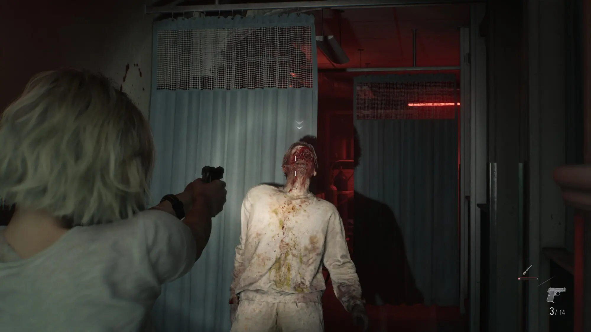 Un enfrentamiento en la Unidad de aislamiento ya con luz roja visible al fondo a través de cortinas hospitalarias — Grace apunta a la cabeza de un infectado en mono blanco manchado de amarillo y rojo. El HUD inferior derecho confirma 3/14 balas. La prioridad de disparo es la cabeza, especialmente en esta zona donde el documento "Mutación doble" advierte de infecciones en cadena.