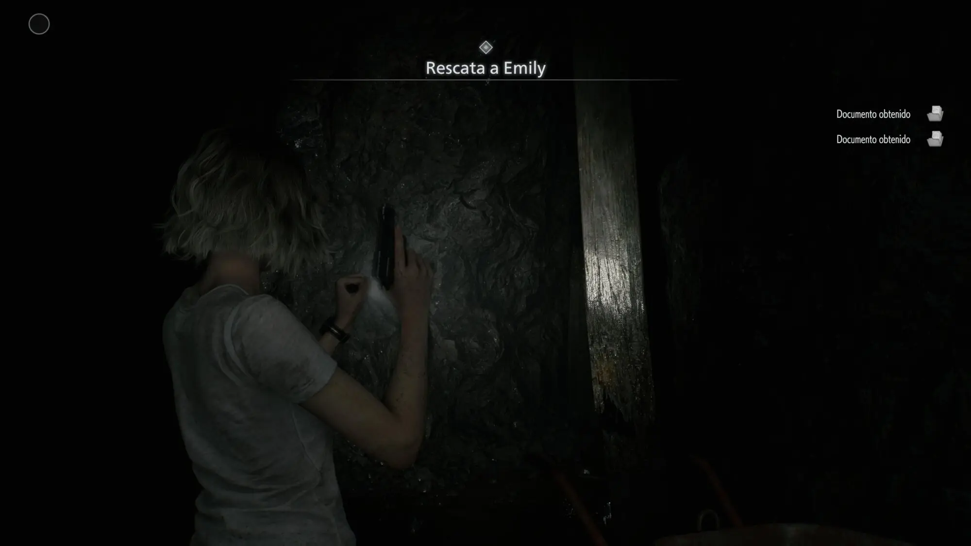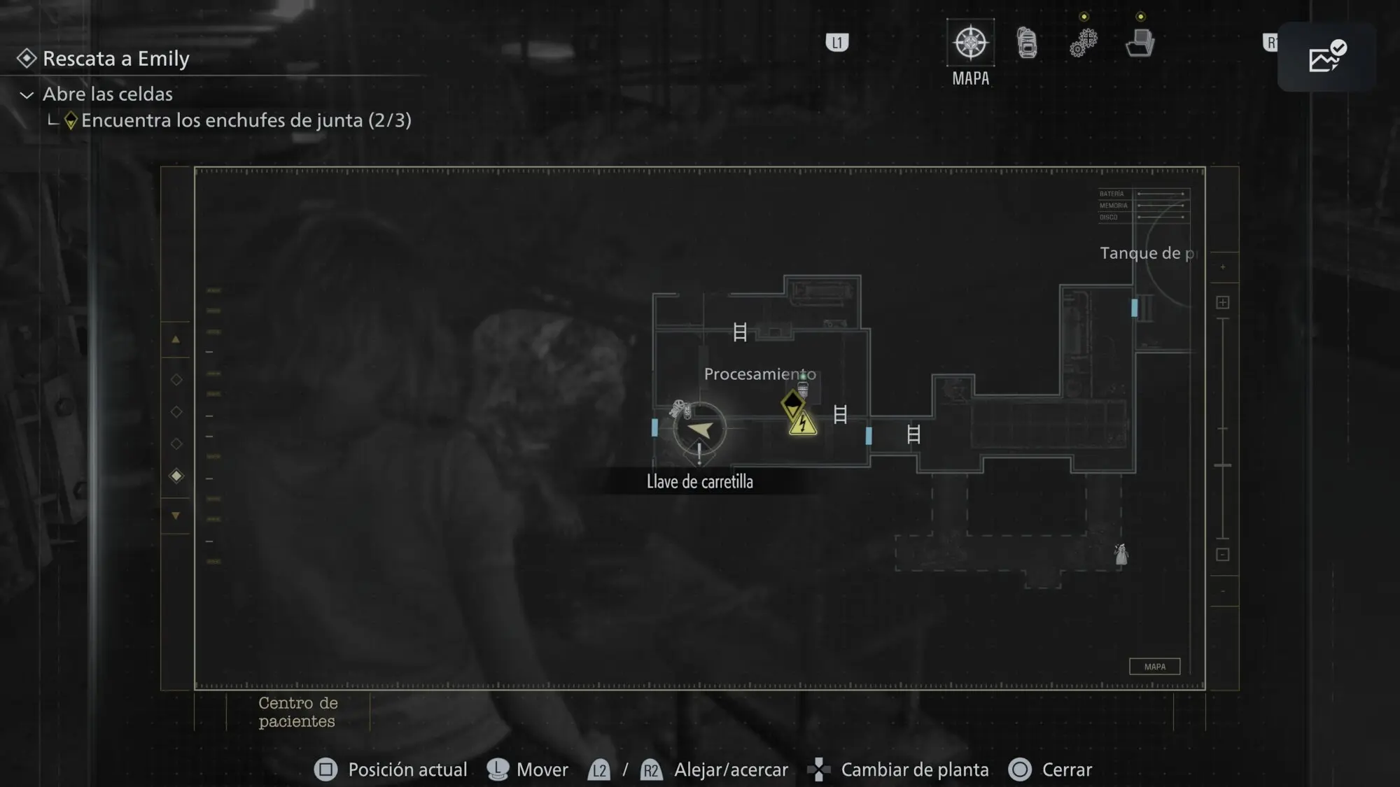 El nuevo objetivo aparece en pantalla: Rescata a Emily. Al mismo tiempo se notifican dos documentos obtenidos seguidos. El mapa en este momento muestra apenas el contorno de un pasillo curvo del Centro de Pacientes. Vas casi a ciegas.