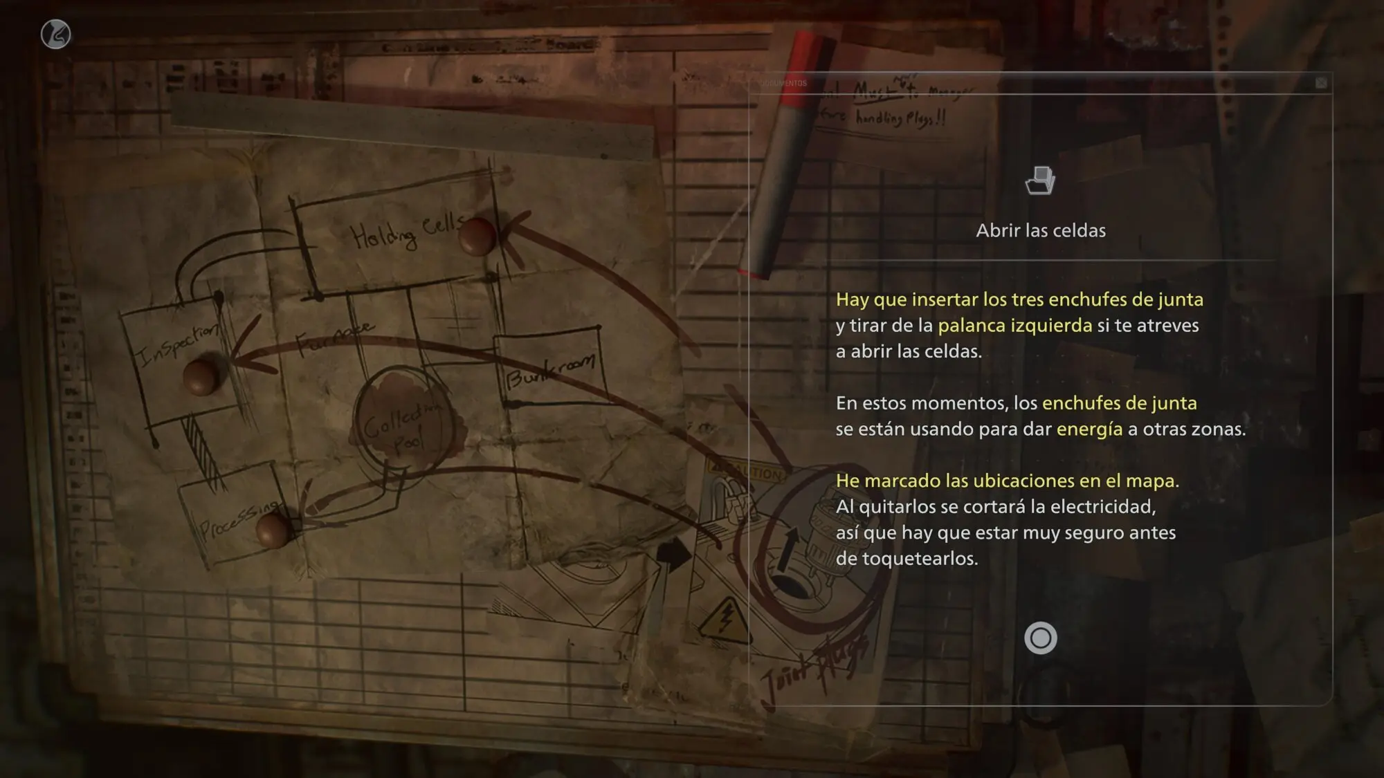 Con el mapa ya más completo, visible la Sala de seguridad y el Ascensor, el objetivo evoluciona. Llegas a un panel de control en la pared con un plano dibujado a mano clavado encima. El documento se llama "Abrir las celdas" y explica exactamente qué necesitas: insertar los tres enchufes de junta en sus tomas y tirar de la palanca izquierda. El problema es que esos enchufes están actualmente dando energía a otras zonas del complejo. Al retirarlos se cortará la electricidad. El contador aparece en pantalla: Encuentra los enchufes de junta (0/3). Grace susurra: "Saldré de esta."