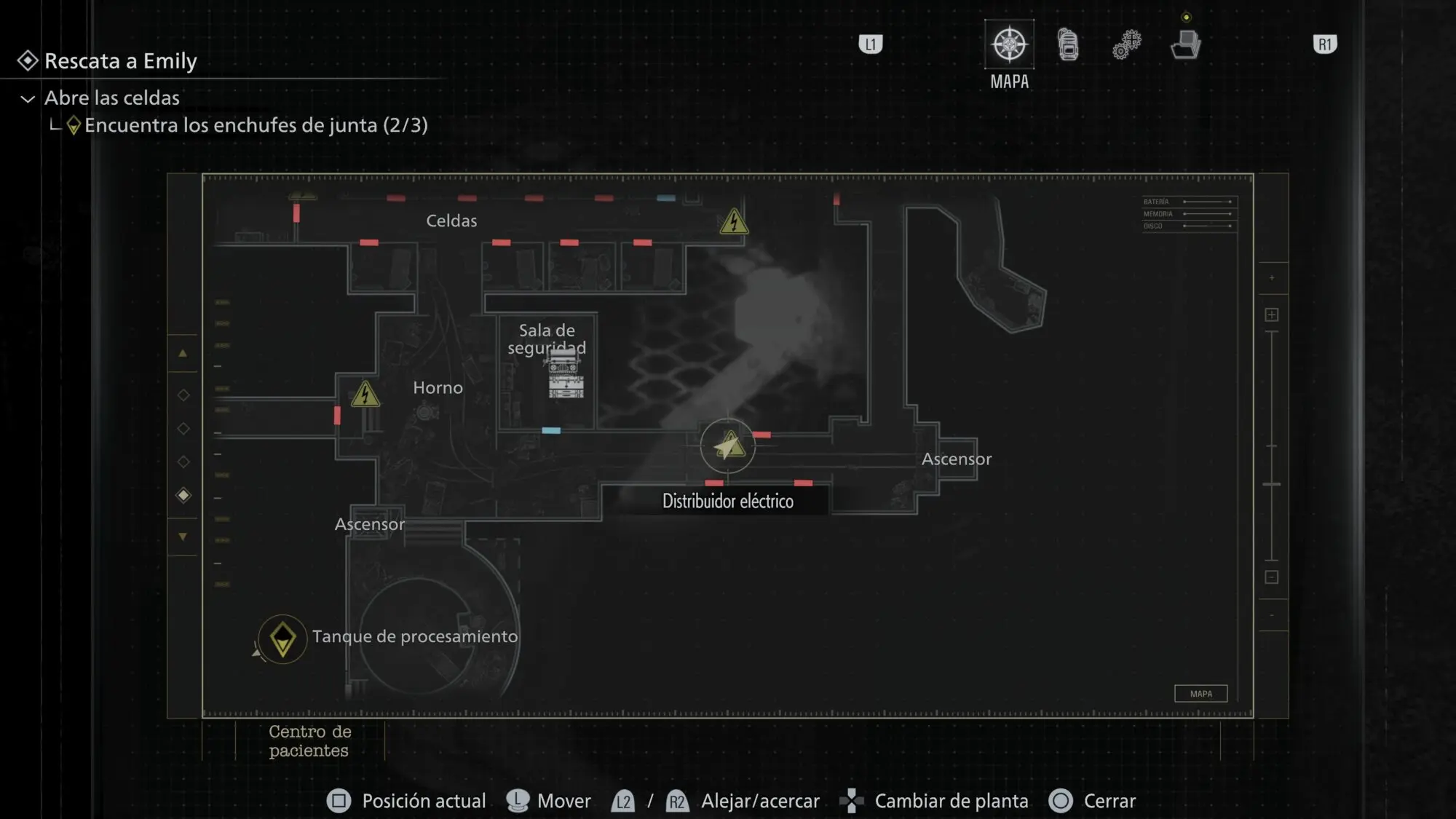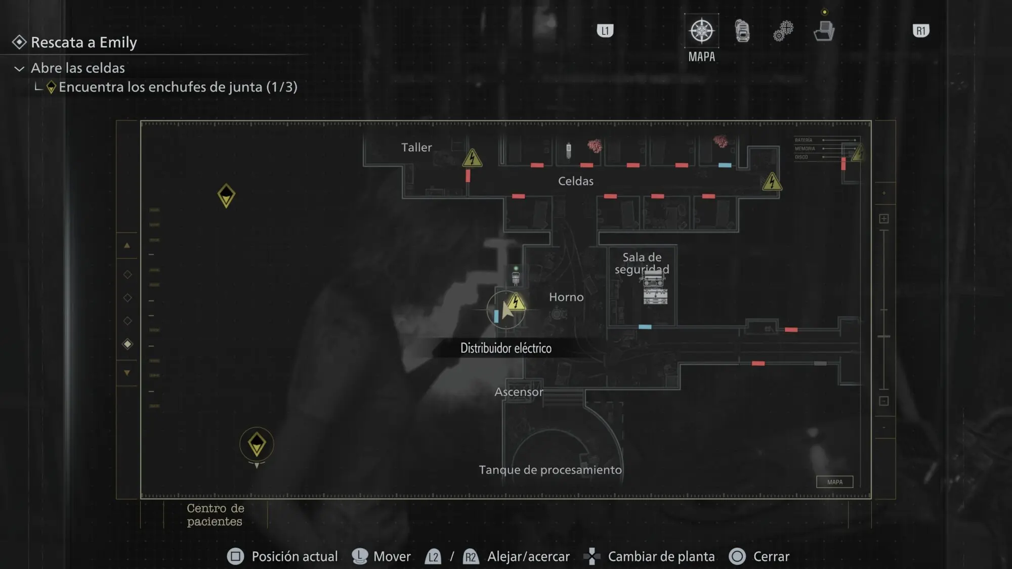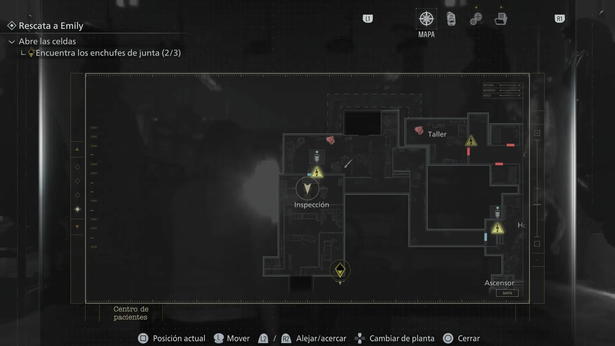 Con el tercer enchufe en el inventario toca volver al panel de control de las celdas. El mapa lo indica claramente: la zona de Inspección conecta con el Taller y desde ahí se accede de nuevo al corredor principal. El objetivo en la parte superior de la pantalla ha cambiado: ya no hay subobjetivo de enchufes, solo "Abre las celdas". Los tres están recogidos.