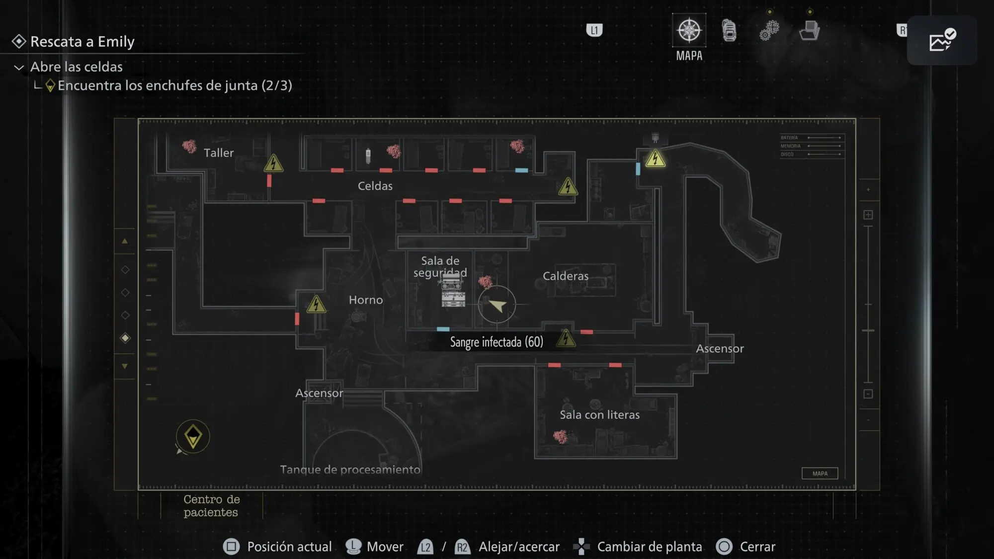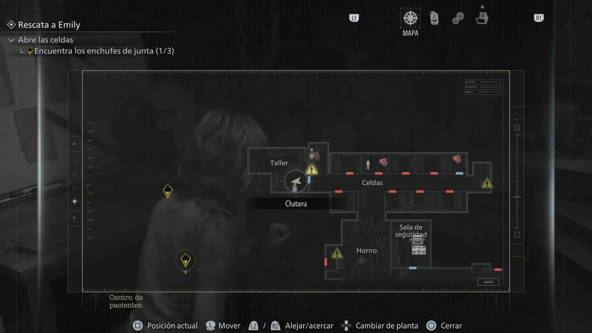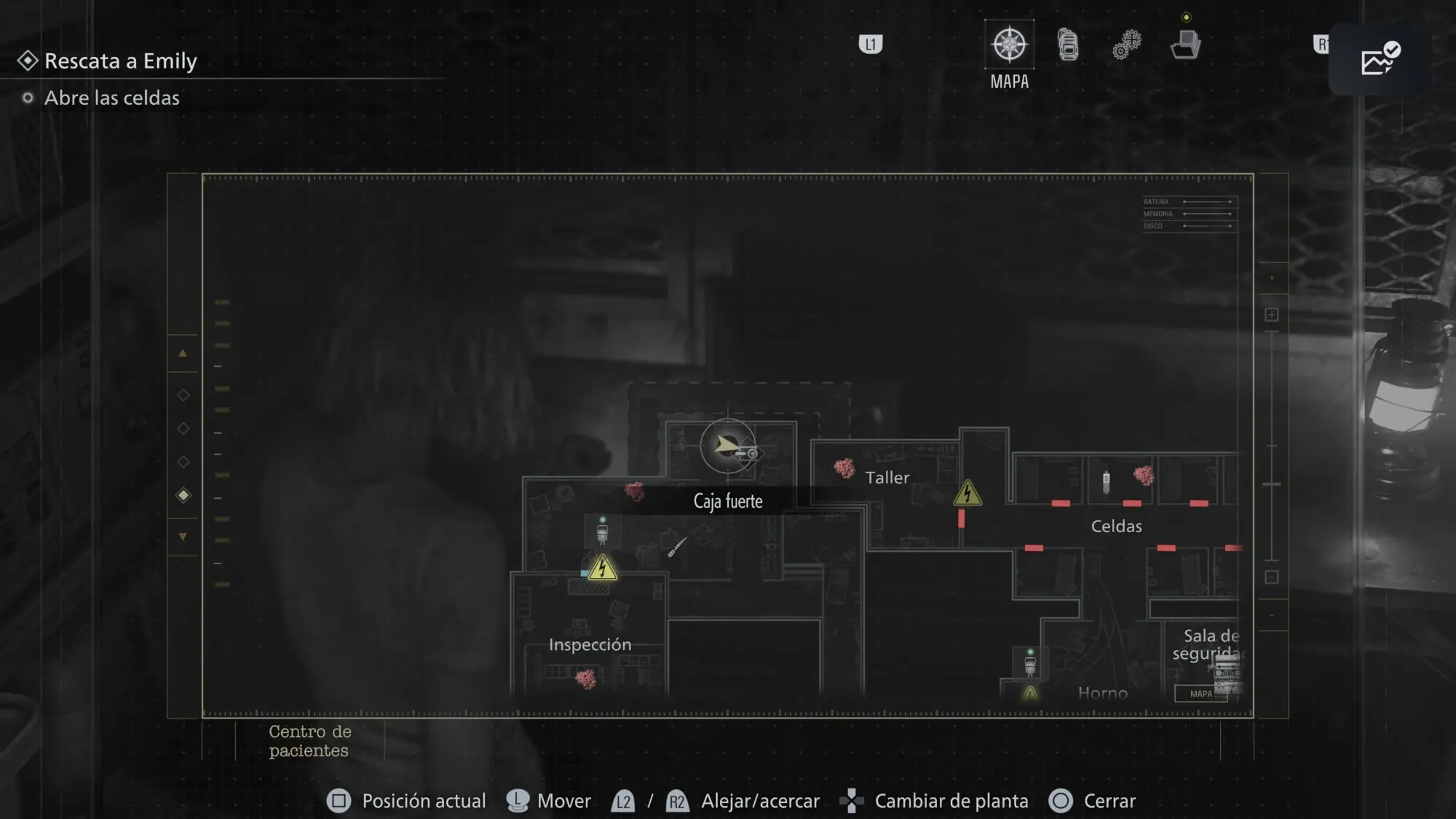 Con el tercer enchufe en el inventario toca volver al panel de control de las celdas. El mapa lo indica claramente: la zona de Inspección conecta con el Taller y desde ahí se accede de nuevo al corredor principal. El objetivo en la parte superior de la pantalla ha cambiado: ya no hay subobjetivo de enchufes, solo "Abre las celdas". Los tres están recogidos.