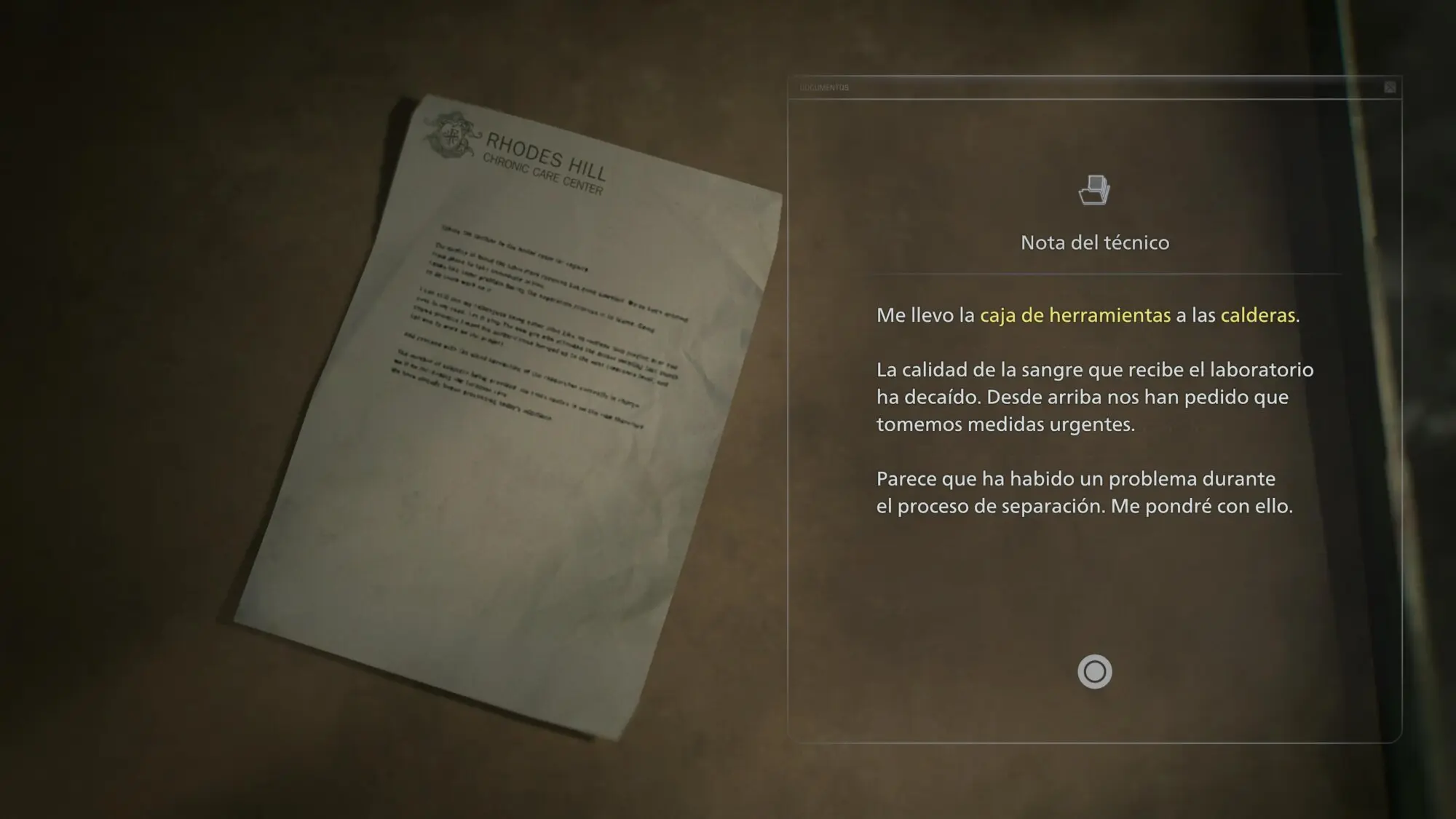 En la zona del taller encuentras la Nota del técnico, con membrete del Rhodes Hill Chronic Care Center. Es breve: se llevó la caja de herramientas a las calderas porque la calidad de la sangre que recibe el laboratorio ha bajado y hay un problema en el proceso de separación. Una nota aparentemente mundana que confirma algo que el juego lleva insinuando desde el principio: aquí procesaban sangre a escala industrial.