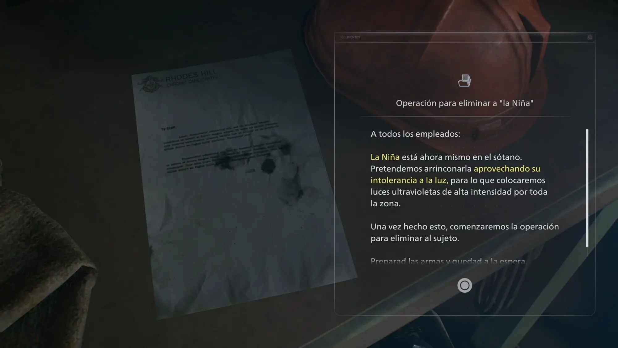 También en la sala de seguridad encuentras el segundo documento de este tramo. Membrete oficial del Rhodes Hill Chronic Care Center, dirigido a todos los empleados. El texto es directo: "la Niña" está en el sótano y el plan es acorralarla aprovechando su intolerancia a la luz colocando lámparas ultravioletas de alta intensidad por toda la zona. La orden termina con una instrucción que no deja margen: preparad las armas y quedaos a la espera. Esto no era un centro médico. Era otra cosa completamente distinta.