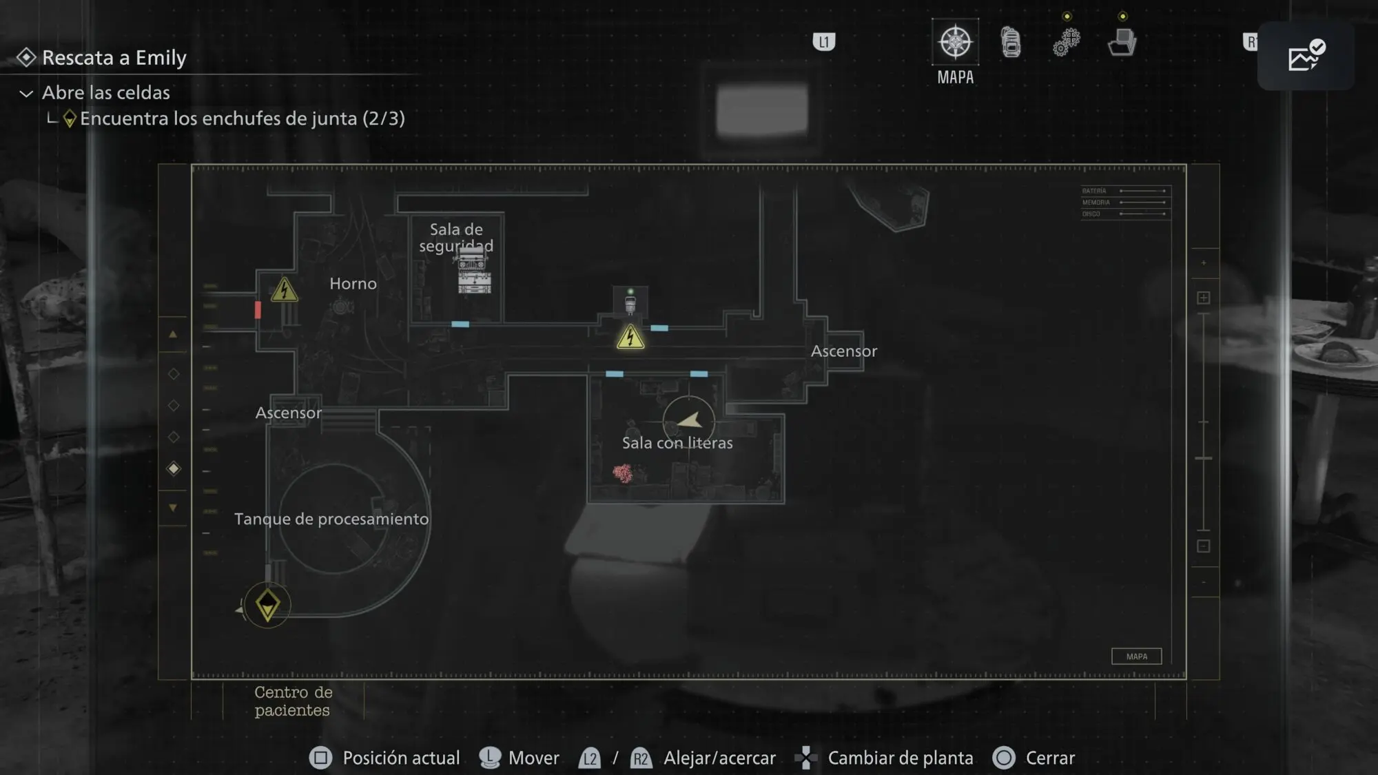 Al abrir el mapa por primera vez en esta sección solo ves un pasillo curvo con tu posición marcada y muy poco más. El Centro de Pacientes está casi sin descubrir. La única forma de orientarse es explorar con cuidado y recoger todo lo que aparezca por el camino.
