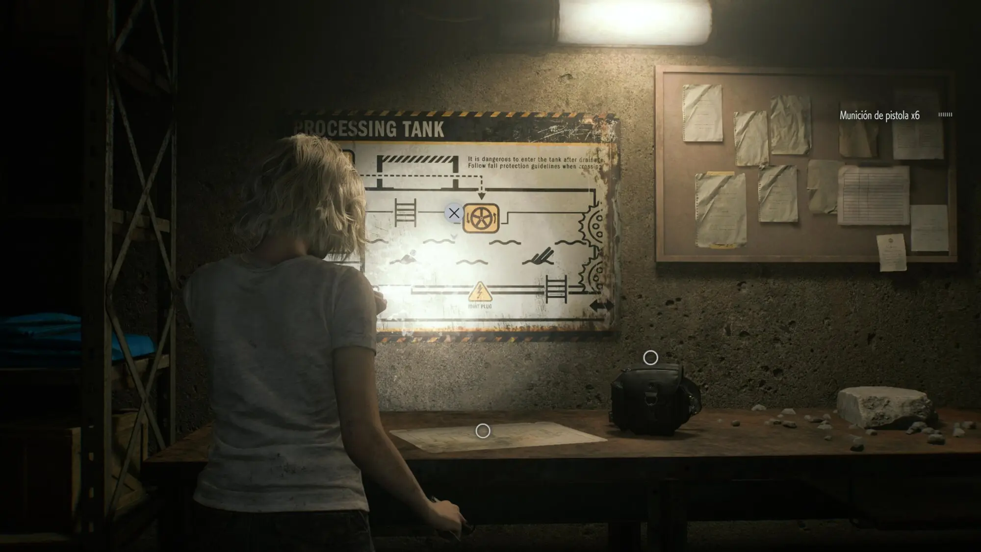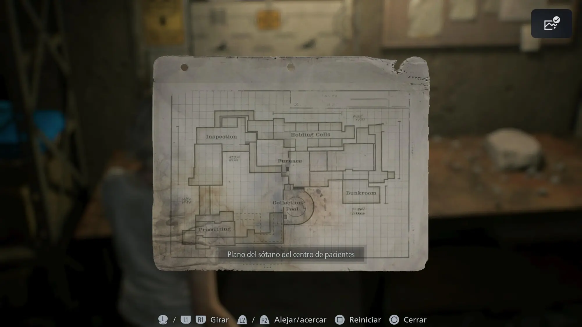 En la misma sala, sobre una mesa de trabajo, hay un objeto interactivo importante: el Plano del sótano del centro de pacientes. Es un plano arquitectónico original dibujado a mano con las zonas etiquetadas en inglés: Holding Cells, Furnace, Inspection, Bunkroom, Collection Pool, Processing. Es el mapa original de lo que fue este lugar antes de convertirse en lo que estás viendo ahora. Recógelo. Al girarlo puedes ver la distribución completa del sótano con todo el detalle.