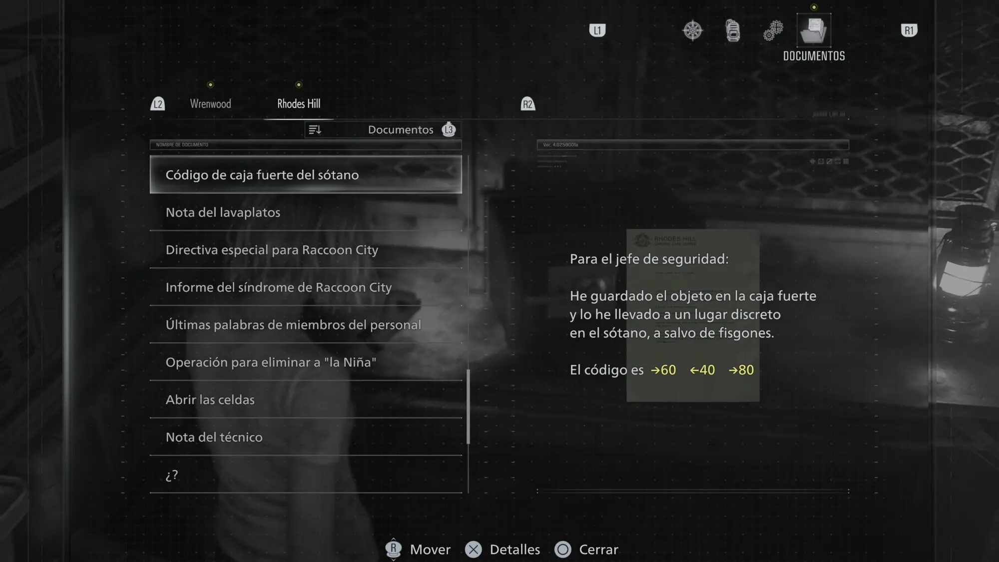Antes de llegar al panel de las celdas con los tres enchufes, hay un desvío que merece la pena. En el menú de documentos de Rhodes Hill aparece uno nuevo que no tenías antes: "Código de caja fuerte del sótano". Está dirigido al jefe de seguridad e informa de que han guardado un objeto en una caja fuerte en un lugar discreto del sótano. El código está ahí mismo: →60 ←40 →80.