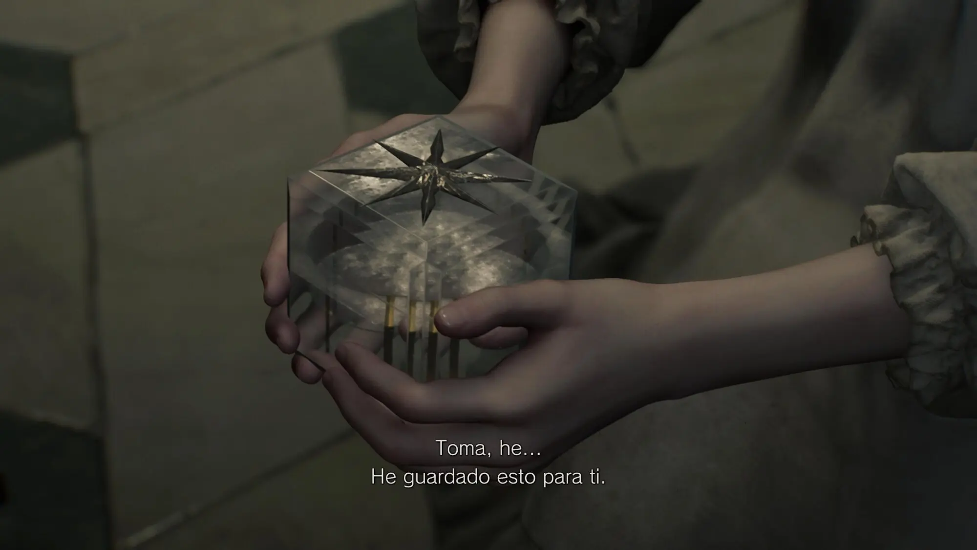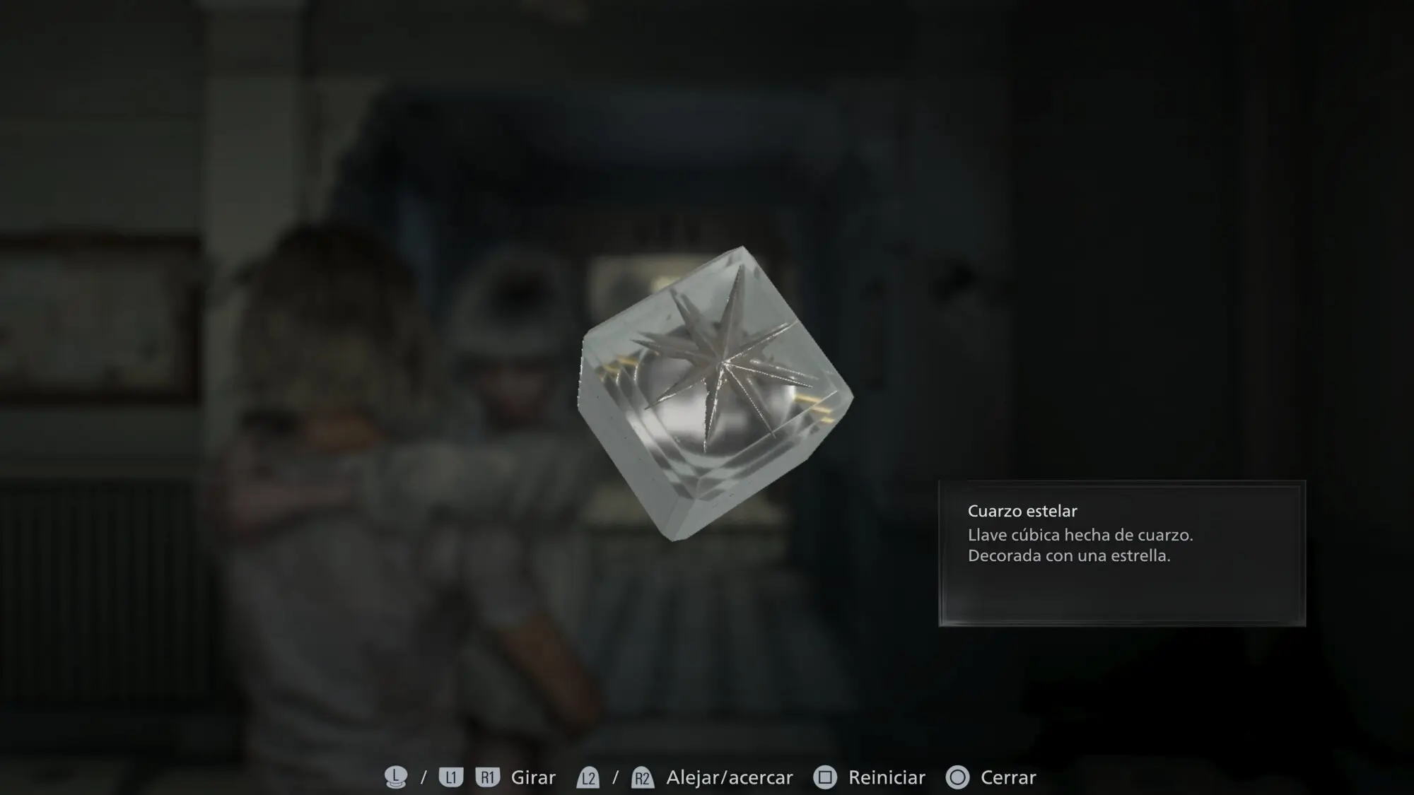 Tras subir al ascensor y estás a salvo, ambas se abrazan y Emily le da a Grace algo que estaba guardando desde su último encuentro...Lo que le da es el Cuarzo estelar: una llave cúbica hecha de cuarzo transparente decorada con una estrella de ocho puntas grabada. El juego lo describe como "llave cúbica hecha de cuarzo, decorada con una estrella". Es la última pieza que nos faltaba para salir del Centro de Pacientes.