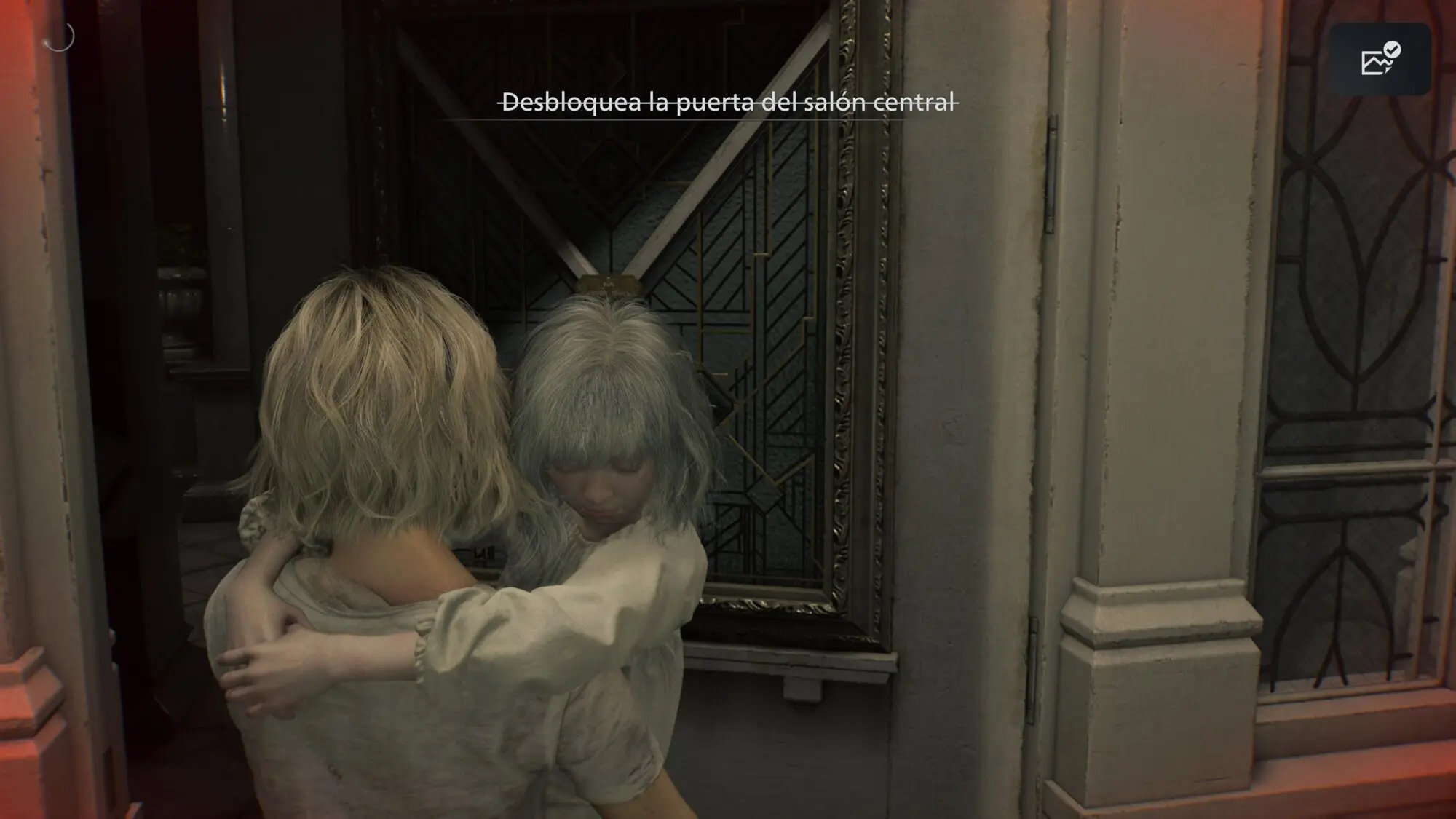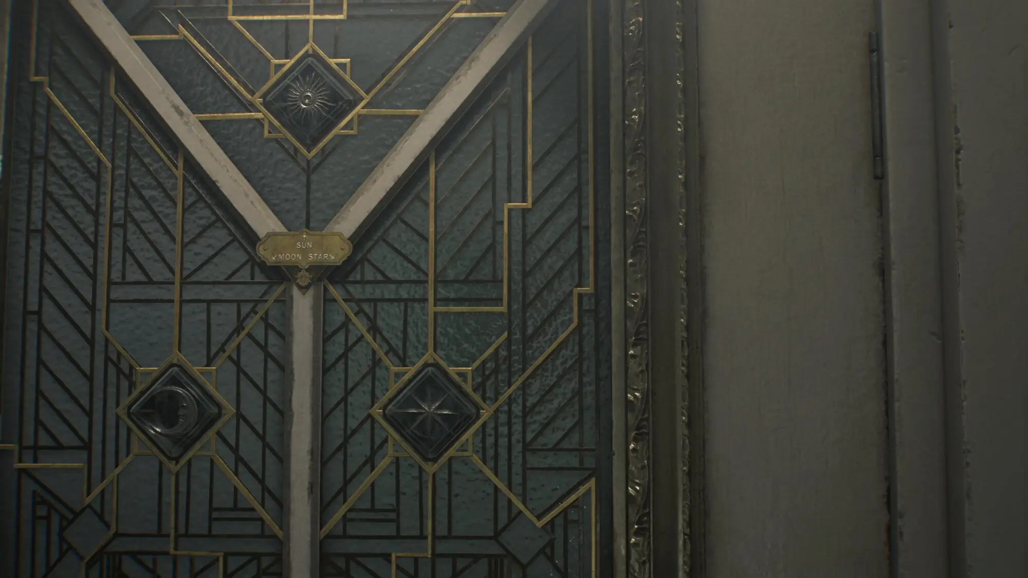 Con Emily a su lado, Grace llega a la puerta decorativa del Salon Principal con símbolos grabados: SUN, MOON y STAR. El hueco de STAR es donde encaja el Cuarzo estelar el último que nos quedaba para la libertad. Al insertarlo la puerta cede. El objetivo tachado en pantalla confirma que "Desbloquea la puerta del salón central" ya está completado.