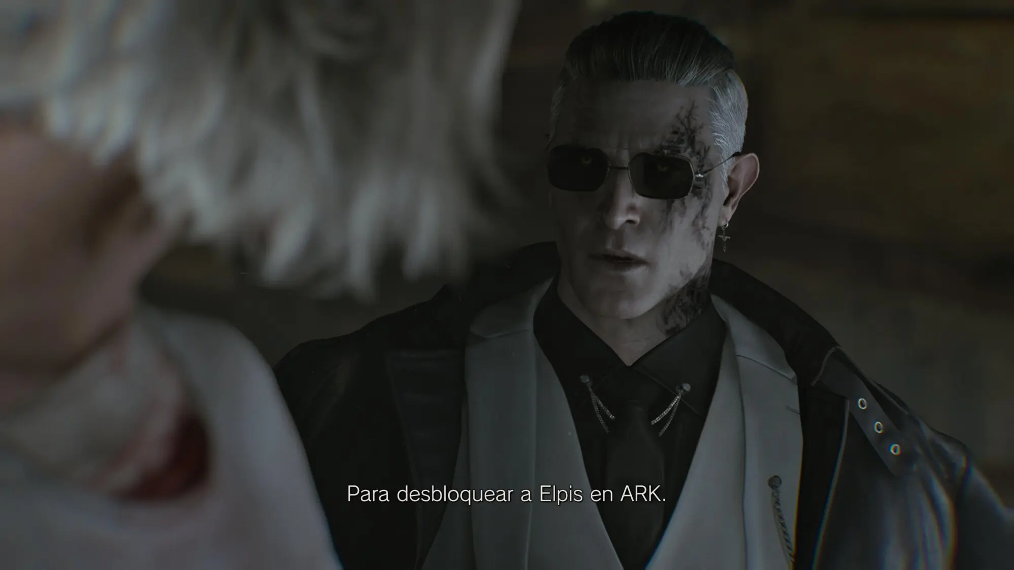 Zeno sigue ahí, frente a Grace, en la sala de monitores de la oficina este. Pelo plateado peinado hacia atrás, gafas de sol oscuras, gabardina negra sobre traje blanco, las venas oscuras visibles en la sien y el cuello — marcas que delatan una exposición a algún tipo de agente vírico. Zeno pronuncia la frase que conecta todo: "Para desbloquear a Elpis en ARK."
