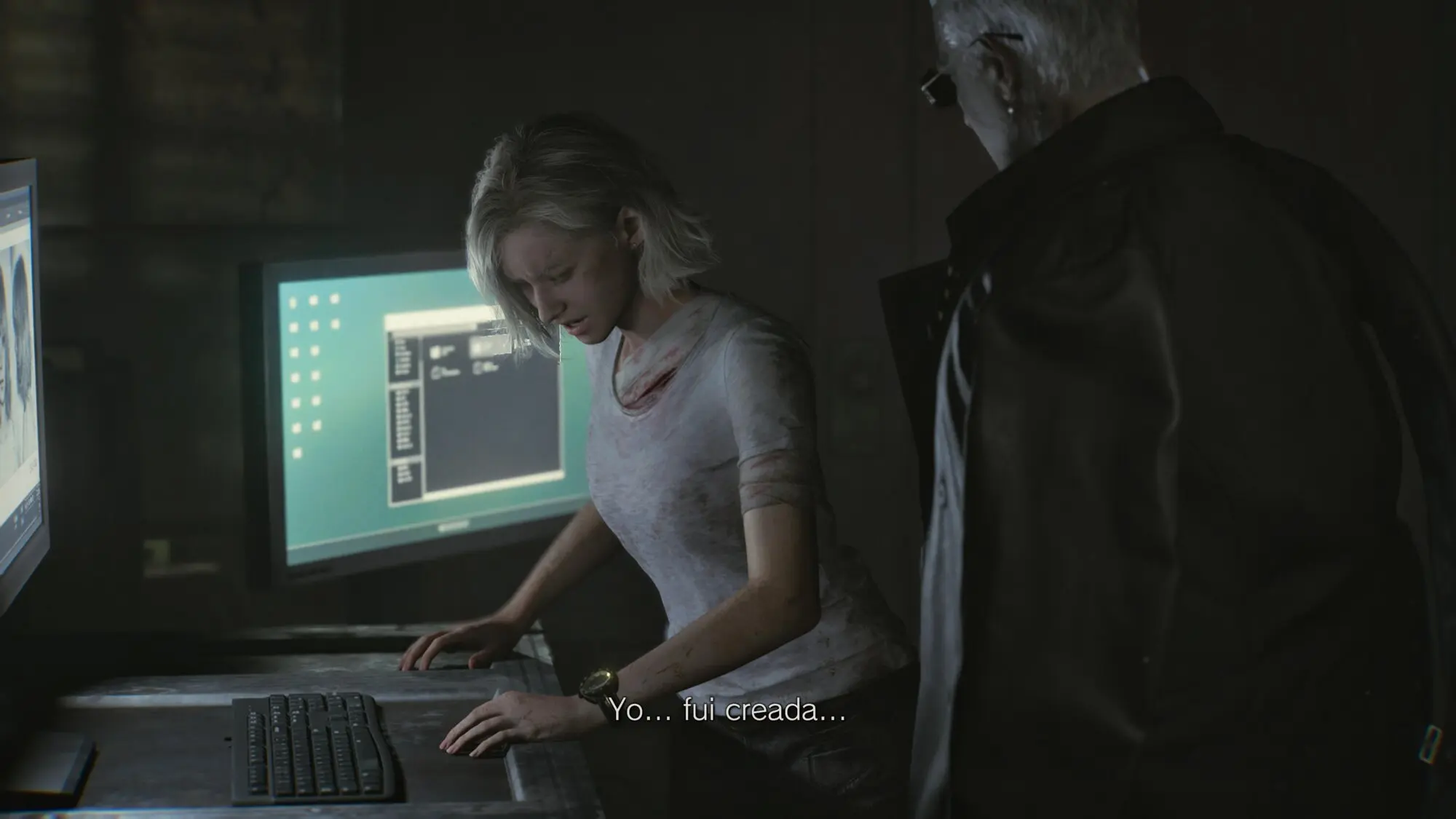 Grace, apoyada contra la mesa con el monitor encendido a su espalda, baja la cabeza y murmura las palabras que el jugador ya sabía pero que ella necesitaba verbalizar: "Yo... fui creada..."