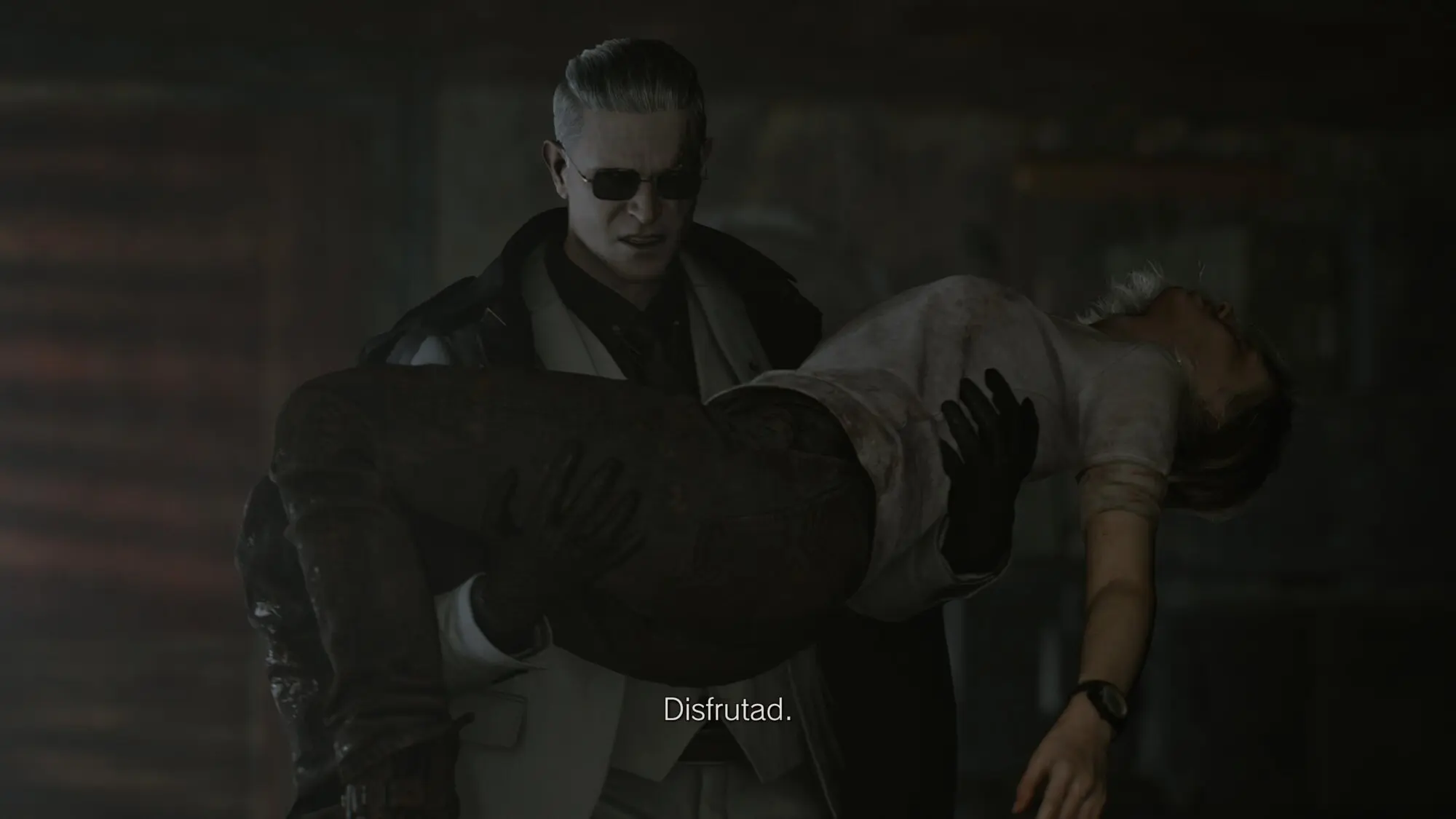 La cinemática corta a Zeno cargando a Grace en brazos. Grace está inconsciente o en estado de shock — el cuerpo laxo, los brazos colgando, la cabeza echada hacia atrás. Zeno la sostiene con una frialdad calculada, sin mostrar ni un atisbo de preocupación real. Su única palabra antes de desaparecer es una provocación directa: "Disfrutad."