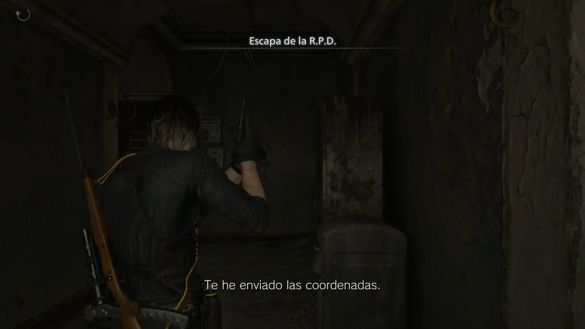 El objetivo se actualiza de forma inmediata: "Escapa de la R.P.D." con el sub-objetivo "Te he enviado las coordenadas." Sherry Birkin — por radio — le ha enviado a Leon la ubicación de ARK. La prioridad ya no es explorar la comisaría. Es salir con vida.