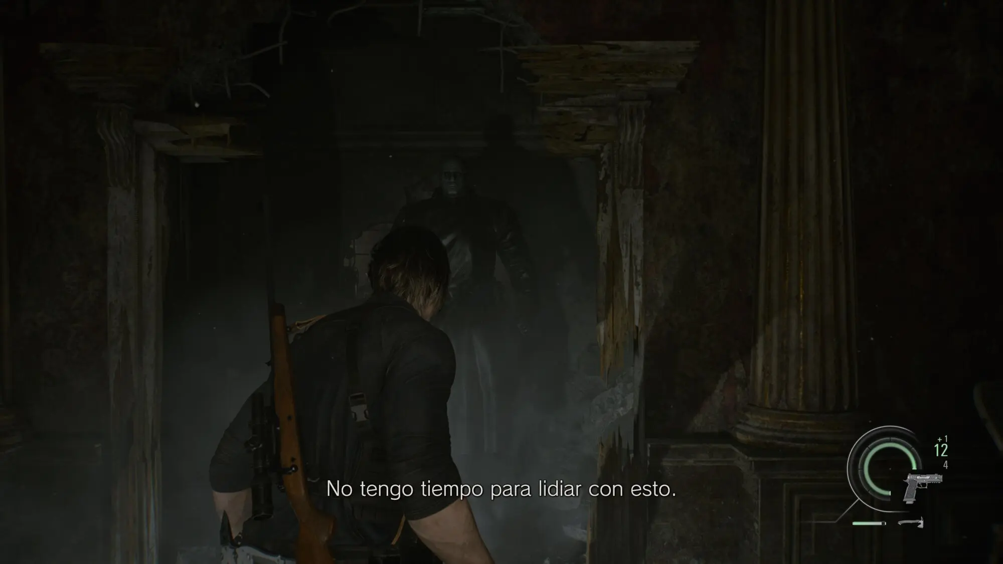 Leon lo resume con la actitud que lo define: "No tengo tiempo para lidiar con esto." El Tyrant aparece enmarcado en un arco de piedra del pasillo, bloqueando la ruta principal. Leon tiene el HUD activo — pistola con 12 balas y 1 cargador de reserva. No es mucho para un Tyrant.