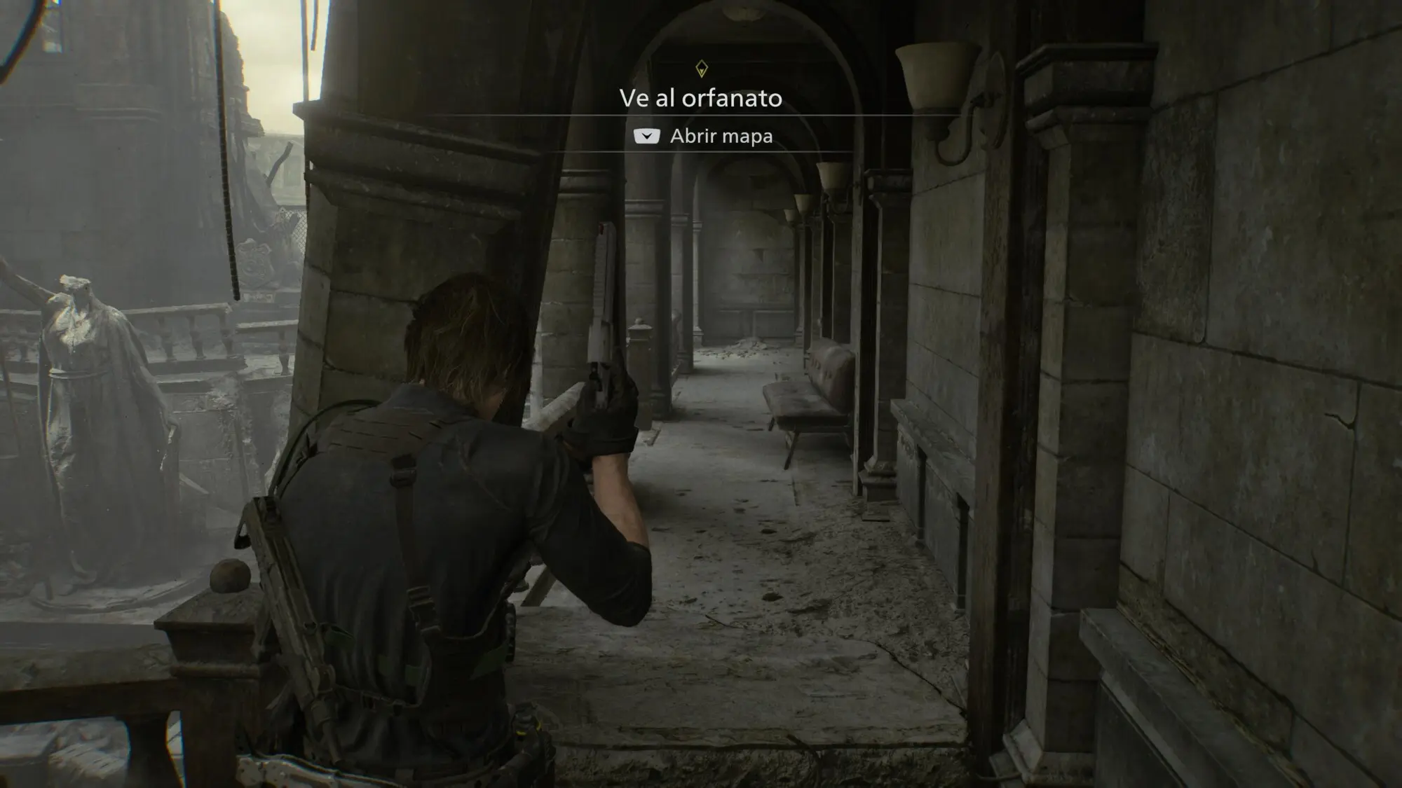 Al escapar de los pasillos interiores, Leon alcanza la galería del segundo piso de la R.P.D. — la balaustrada con vistas al hall principal, columnas de piedra y arcos neoclásicos parcialmente derrumbados. A la izquierda, una estatua cubierta con una sábana blanca. El objetivo se actualiza: "Sigue a Grace" con los sub-objetivos "Escapa de la R.P.D." y "Ve al orfanato."