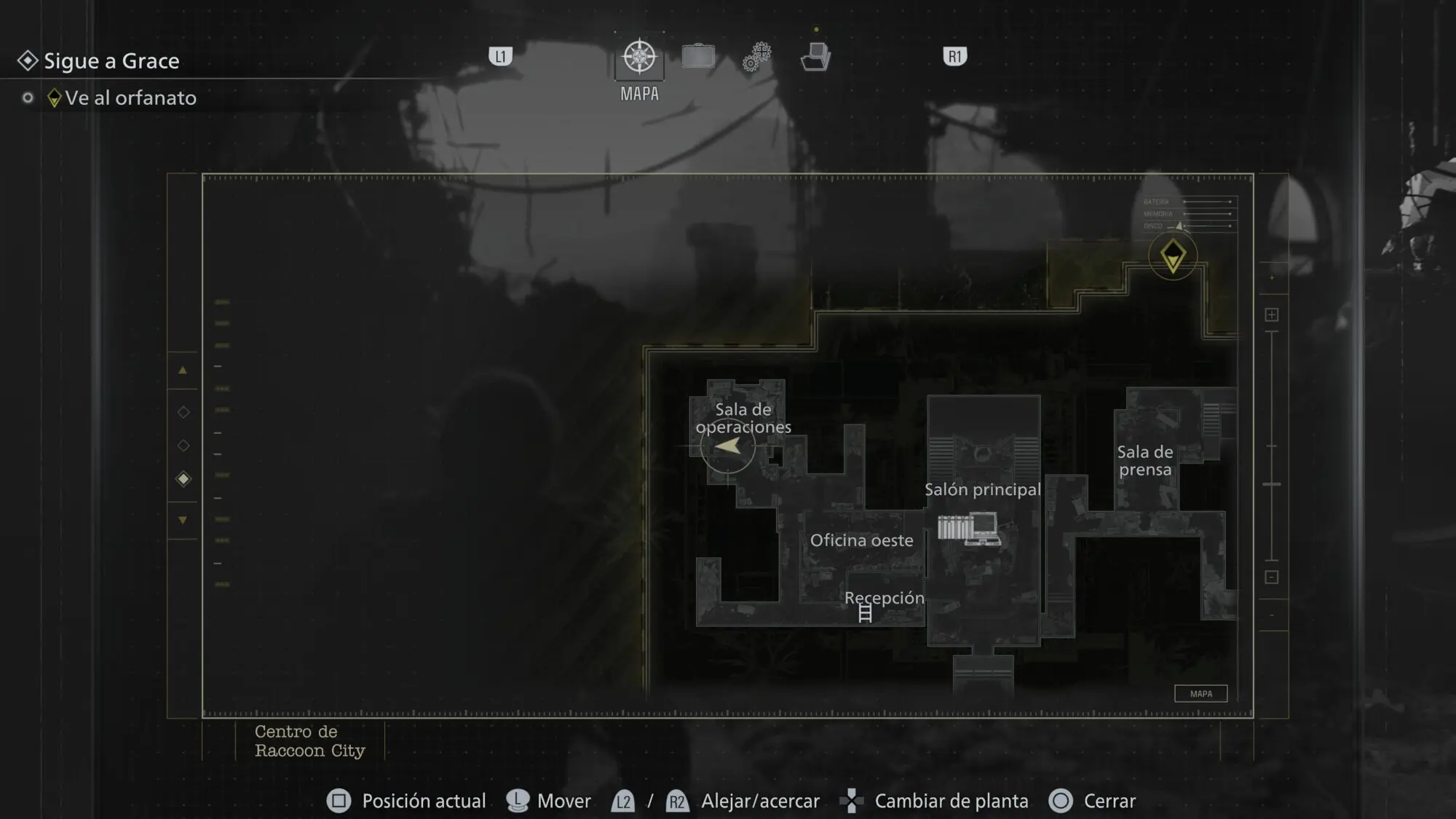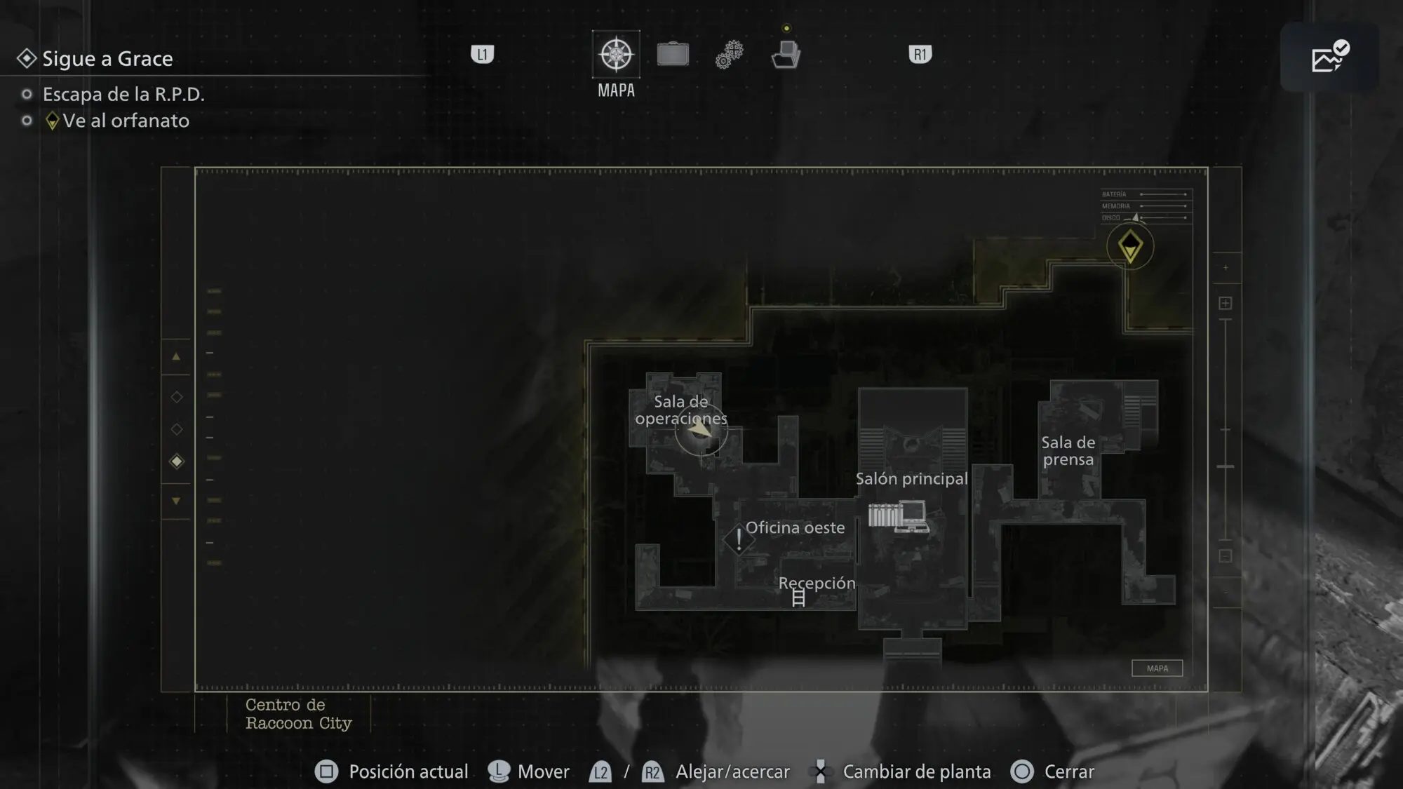 Leon mira el paisaje desolador del centro de Raccoon City desde una perspectiva elevada en la R.P.D. Edificios reventados con las estructuras de hierro expuestas, montañas de cascotes, cielo plomizo con una luz tenue filtrándose entre las nubes. El mapa confirma el objetivo: "Sigue a Grace — Ve al orfanato." Leon se encuentra en la Sala de operaciones de la R.P.D. Te dejo el mapa de la zona para que observes atentamente como una Tofu te observa a escondidas...Aunque no solo puedes verlo en esa zona...