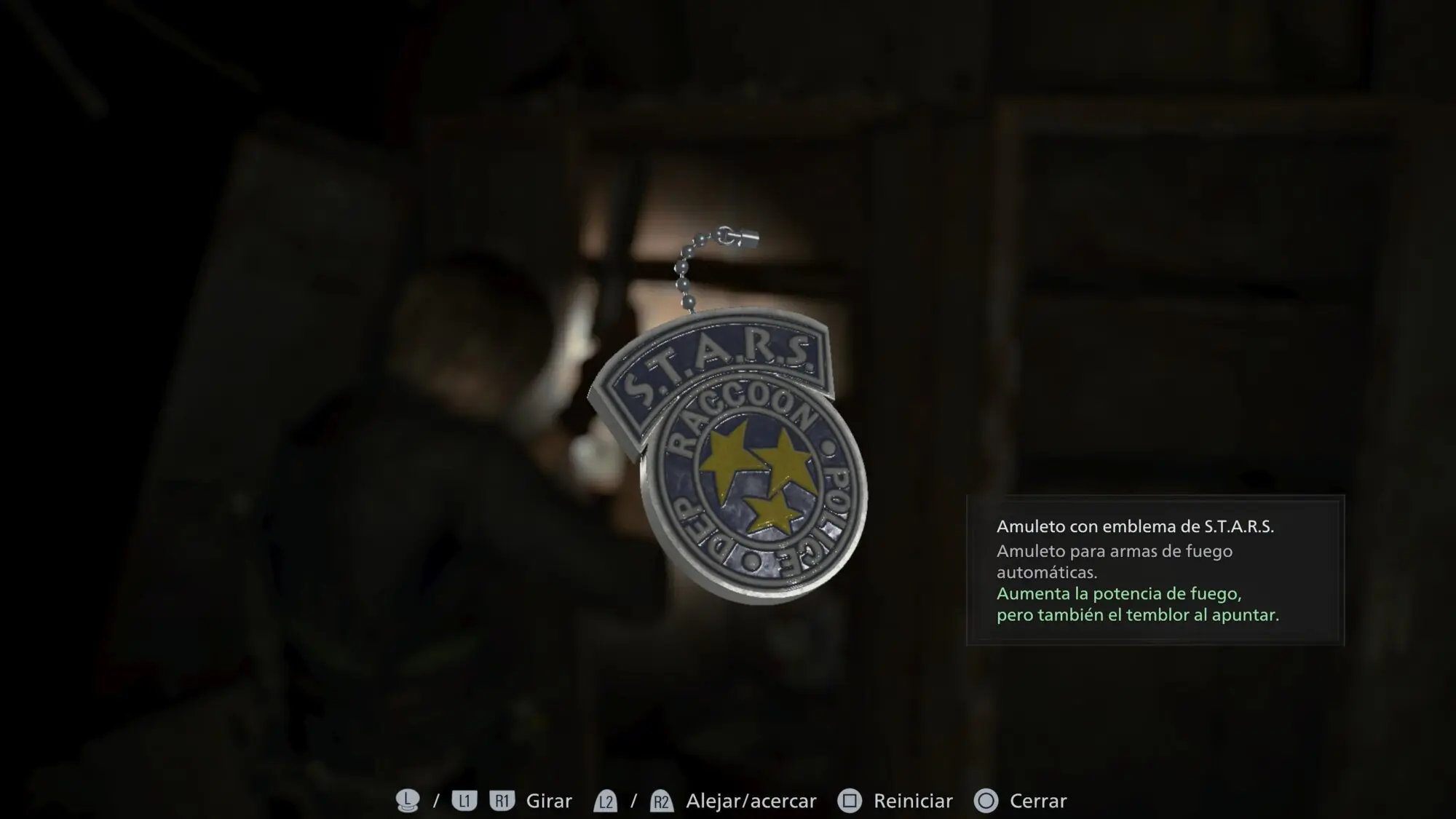 Al abrir la taquilla de JoJo, Leon obtiene un objeto de equipo valioso: el Amuleto con emblema de S.T.A.R.S. Es una placa metálica circular con el escudo clásico de la unidad — "S.T.A.R.S. — RACCOON POLICE DEP." rodeando tres estrellas doradas sobre fondo azul, con una cadena de bolas para colgarlo. La descripción confirma su función: "Amuleto para armas de fuego automáticas. Aumenta la potencia de fuego, pero también el temblor al apuntar."