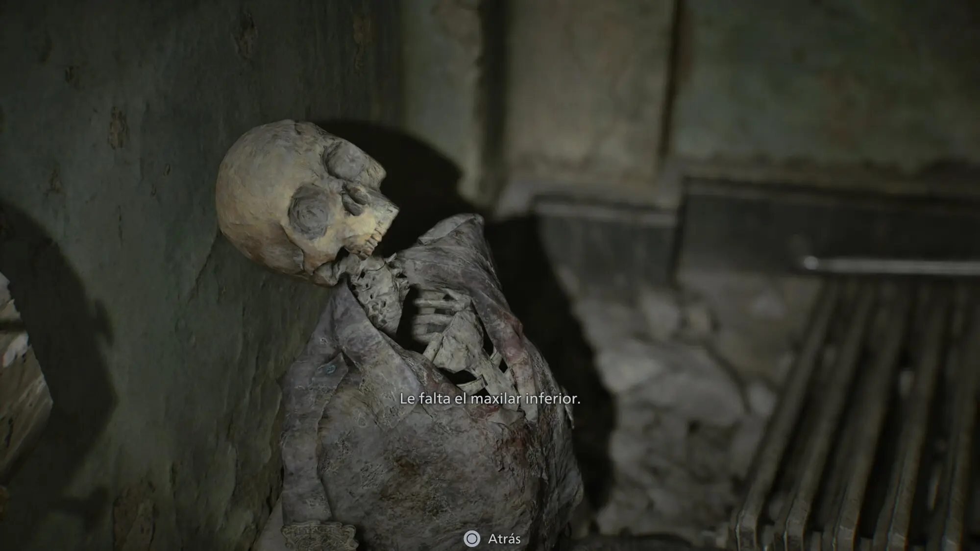 En las zonas más profundas del edificio, Leon examina un cadáver completamente esqueletizado apoyado contra una pared de piedra. Los restos están en posición sentada, con el cráneo inclinado hacia un lado y el tórax parcialmente expuesto. Leon observa un detalle concreto: "Le falta el maxilar inferior." El cráneo no tiene mandíbula — arrancada o descompuesta. Un detalle macabro que sugiere que este cuerpo lleva aquí desde 1998, quizás uno de los muchos que murieron en la comisaría durante el brote original y nunca fueron recuperados. ¿Será el unos de los primeros zombis que nos asustaron en Resident Evil 2?