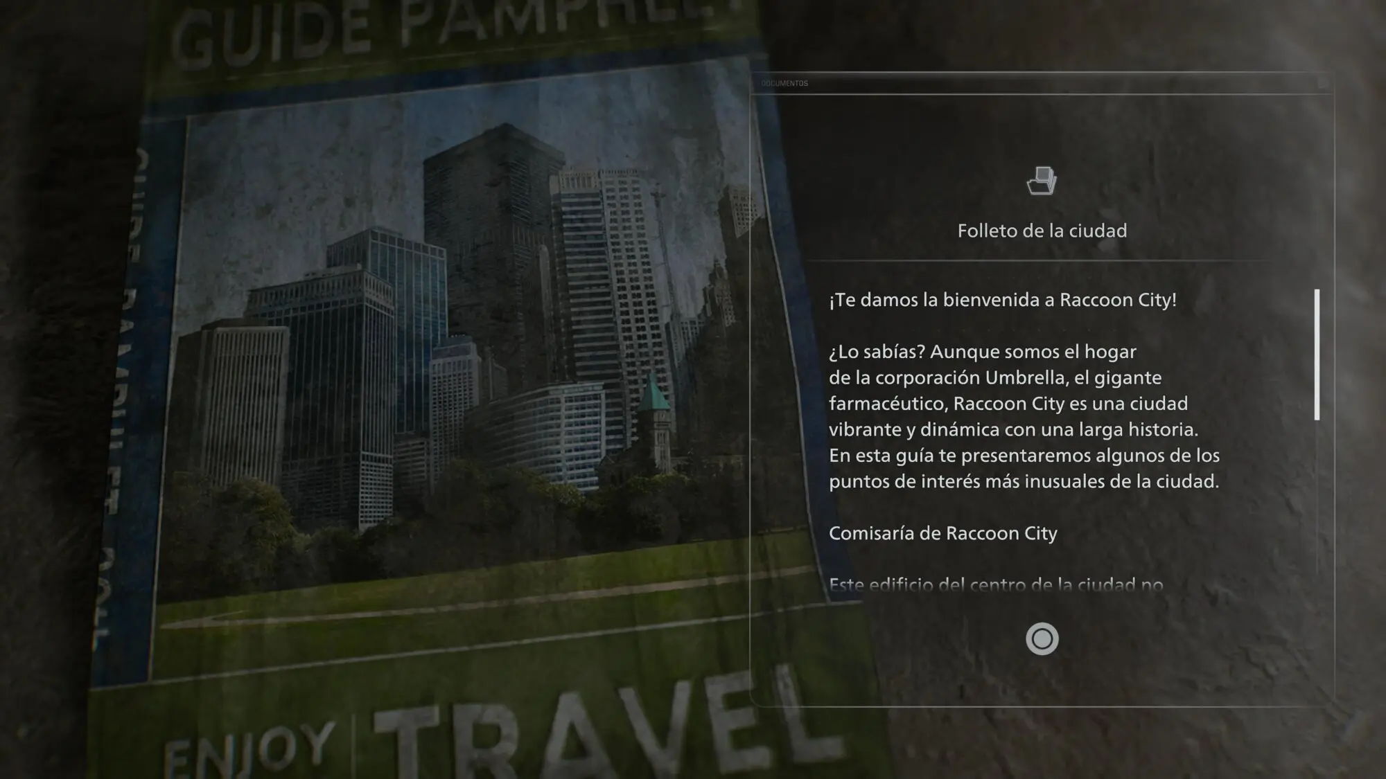 Al salir de la comisaría y adentrarse en las calles del centro, Leon encuentra un folleto turístico de Raccoon City tirado entre los escombros. Es una guía de viaje con el skyline de la ciudad en portada — rascacielos relucientes, árboles verdes, el lema "ENJOY TRAVEL" — y un tono promocional que ahora suena a chiste macabro. El folleto abre con un "¡Te damos la bienvenida a Raccoon City!" y presume de ser "el hogar de la corporación Umbrella, el gigante farmacéutico", presentando la ciudad como "vibrante y dinámica con una larga historia." Entre los puntos de interés destacados está la propia Comisaría de Raccoon City.