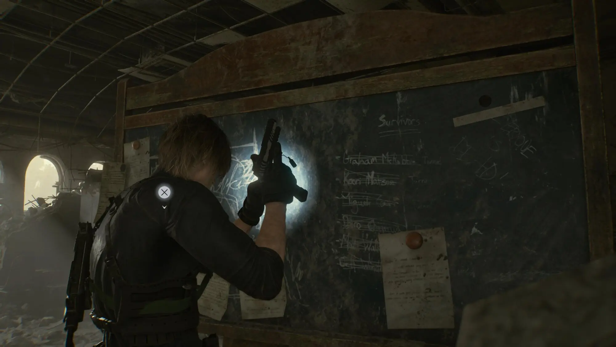 Leon en otra parte de la comisaria con el techo de estructura metálica parcialmente colapsado y escombros por todas partes. En la pared del fondo, una pizarra de tiza con un marco de madera contiene una lista escrita a mano con el título "Survivors". Los nombres están parcialmente borrados por el tiempo y la humedad, pero se distinguen varios: Graham, Kaori Matsuo, y otros más ilegibles. Junto a algunos nombres hay anotaciones que parecen indicar ubicaciones — "Tunnel" aparece junto a al menos dos de ellos. Es una lista de supervivientes del brote de 1998, escrita probablemente en los últimos días antes de la evacuación o el bombardeo. Notas de papel clavadas con chinchetas complementan la información en la pizarra.