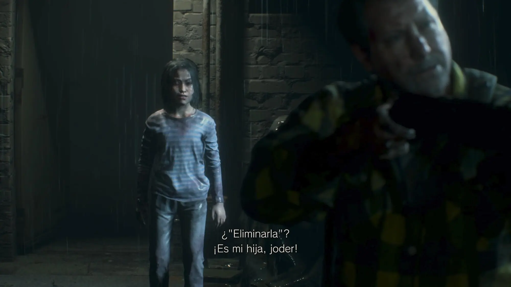 Dentro de la armería, Leon recuerda lo que ocurrió en el pasado...Se encuentra con algo inesperado. Una niña de pelo oscuro, empapada por la lluvia, con camiseta de rayas azules y pantalones claros, lo observa desde las sombras con una expresión perdida. Detrás de ella, la silueta borrosa de un hombre adulto se recorta contra la luz del exterior — un hombre con chaqueta de camuflaje. La escena es tensa.